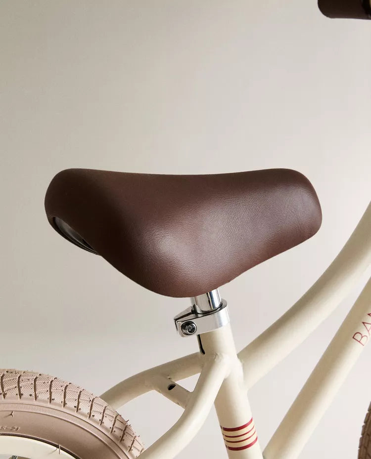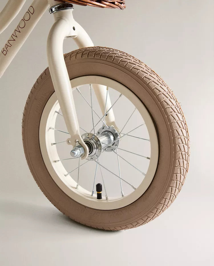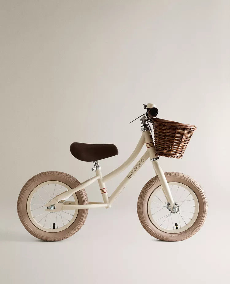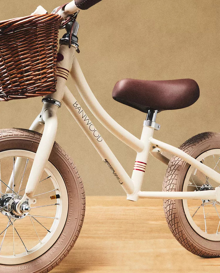 Bicicleta infantil de equilíbrio, sem pedais. Fabricada pela Banwood em cor lisa com pormenor de riscas. Inclui cesto de vime entrançado e campainha. As bicicletas de aprendizagem ajudam no desenvolvimento dos mais pequenos, promovendo a mobilidade e facilitando a sua transição para a bicicleta de pedais.