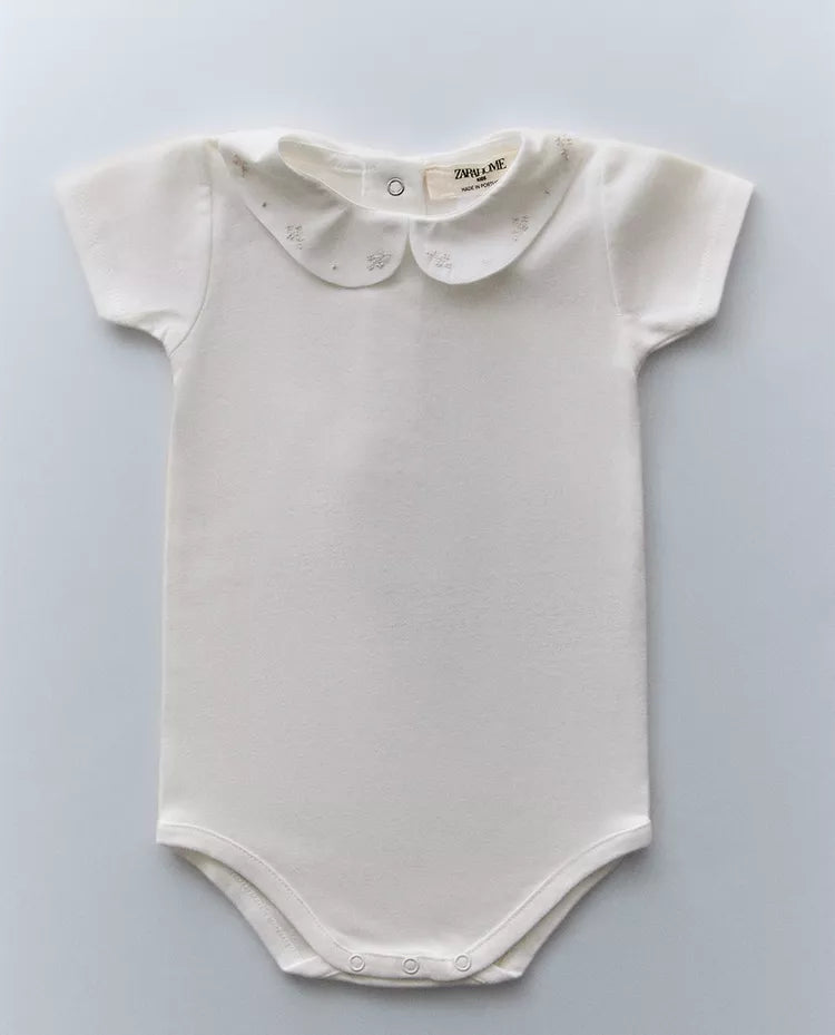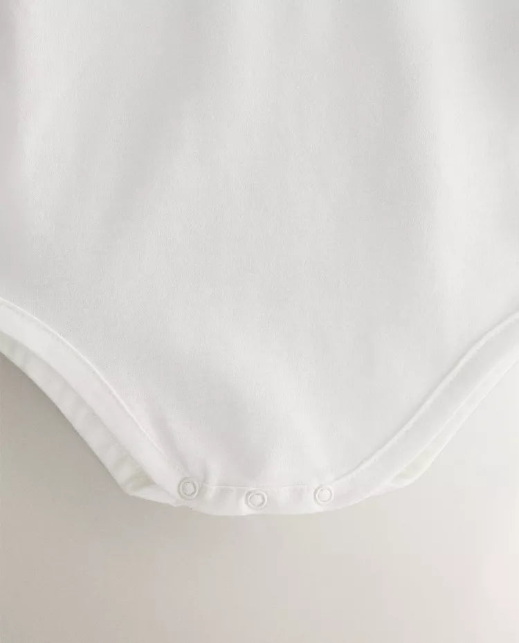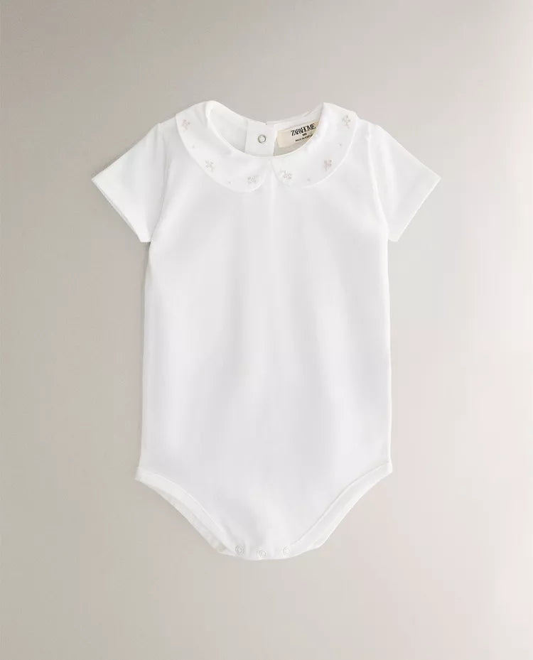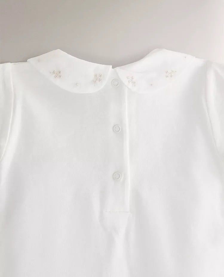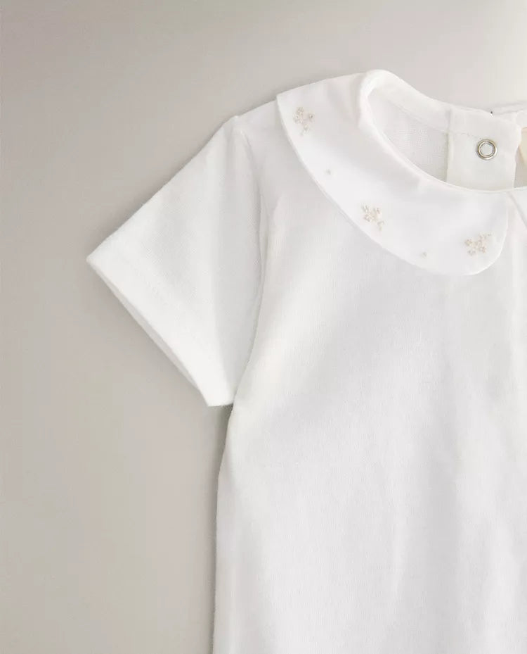 Body infantil de manga curta 100% algodãocom pormenor de flores bordadas na gola.Fecho de botão de pressão atrás. Tamanho 0-1... Read more
