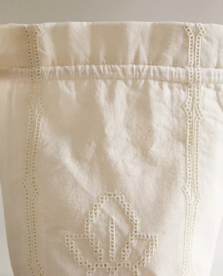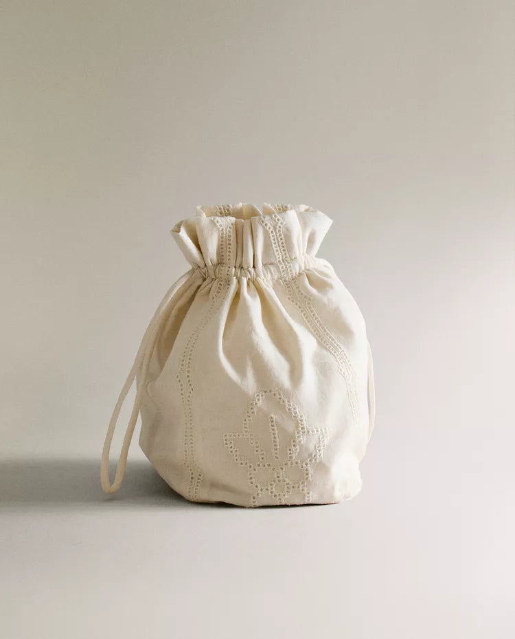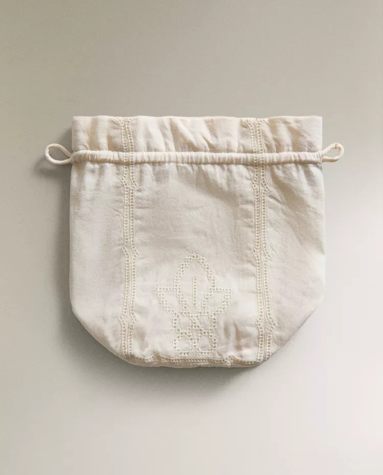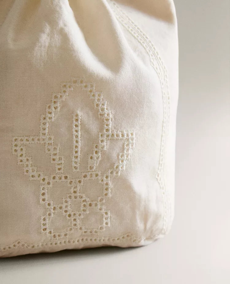 Bolsa tipo saco de tamanho pequeno, confecionada em algodão com bordados. Ajusta-se com cordão. Altura Largura Profundidade 18cm 18cm 9cm... Read more