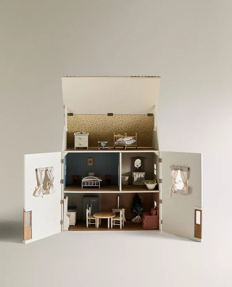 Casa de bonecas infantil de brincar em madeira com cortinas de tecido. Tem 4 divisões: uma no rés do chão,... Read more