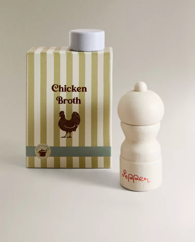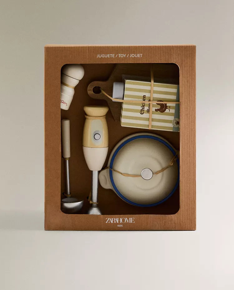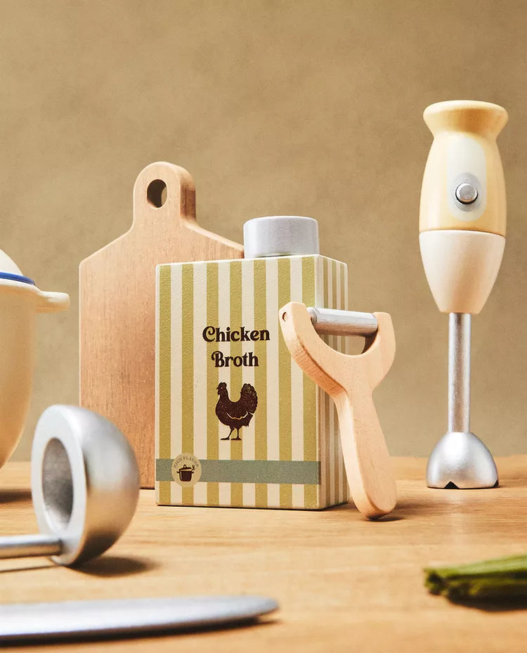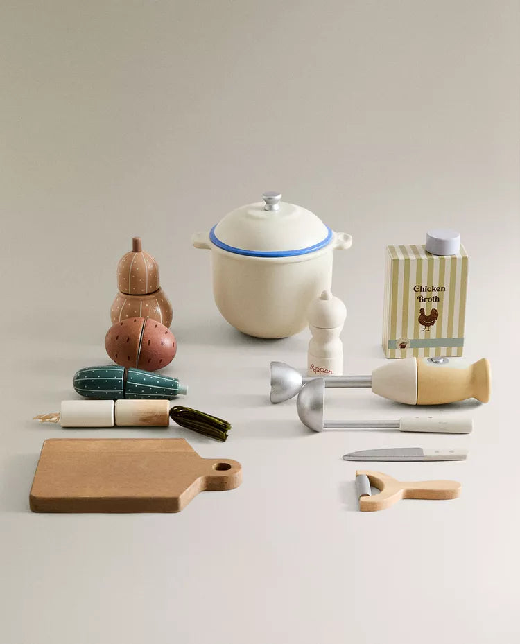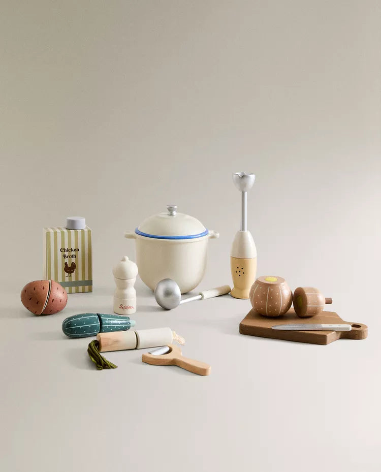 Conjunto de brinquedos em forma de diferentes alimentos e utensílios necessários para preparar uma sopa. Inclui uma varinha mágica que,... Read more