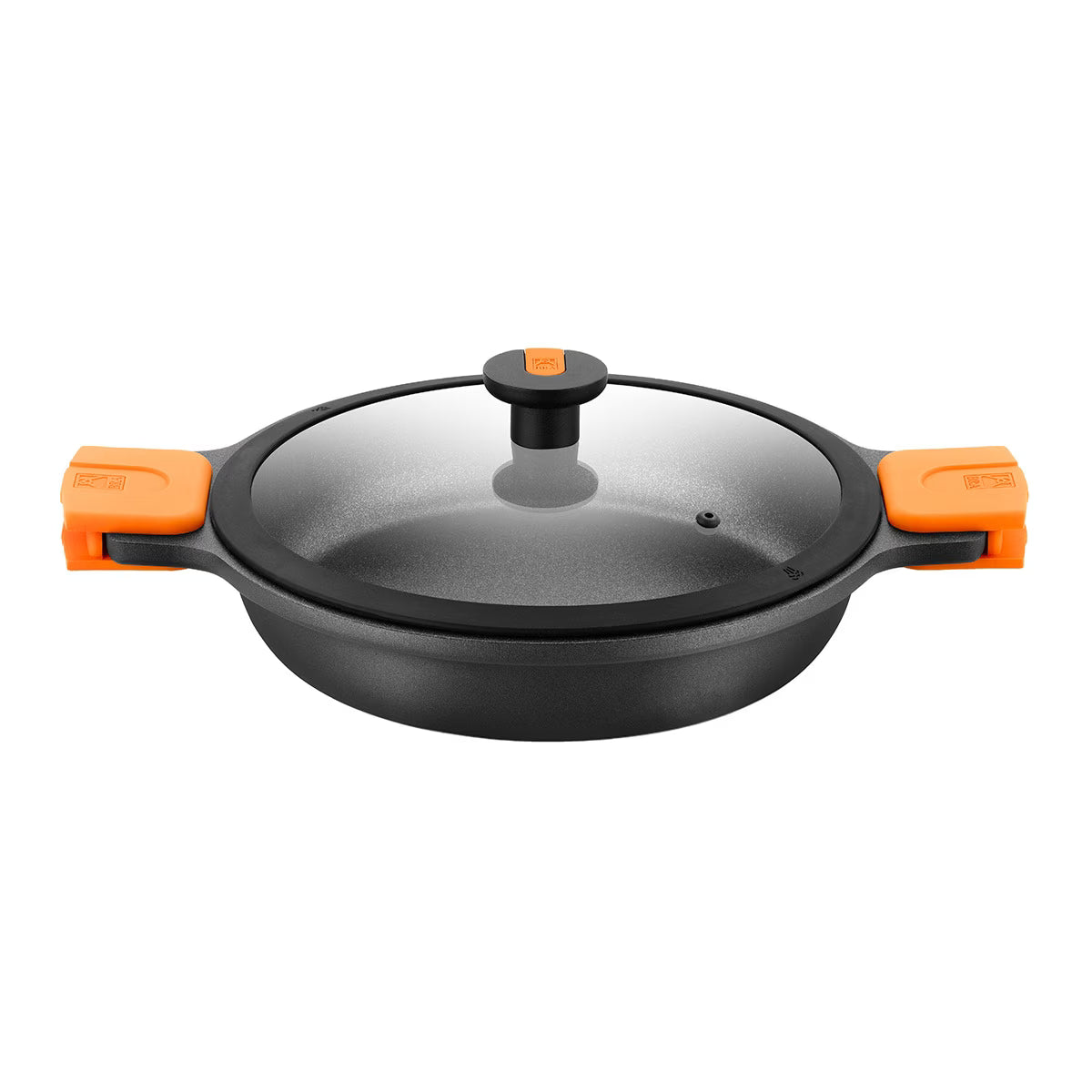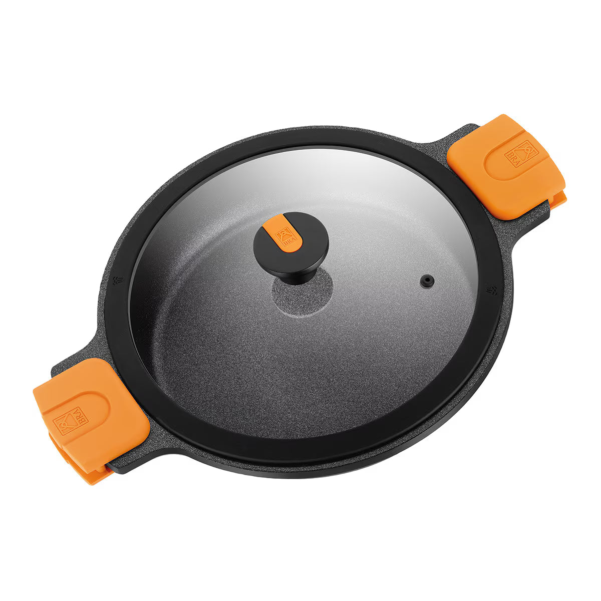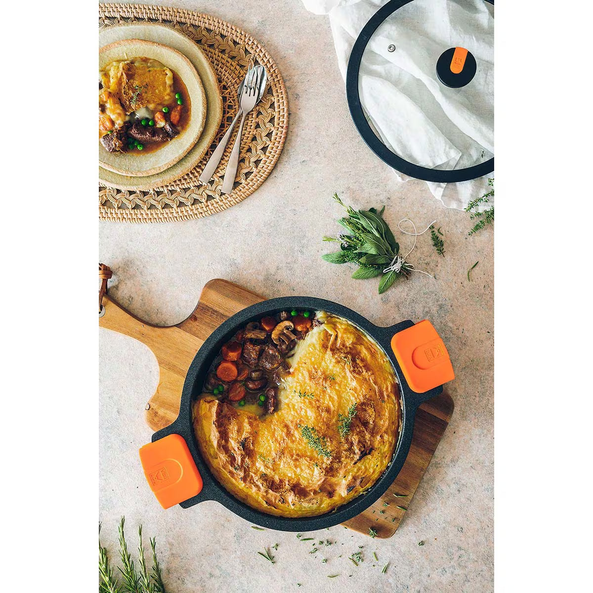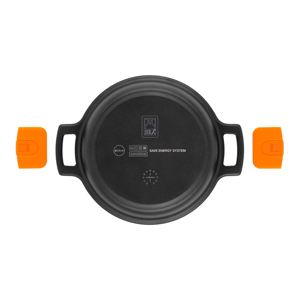 La tapa de la cacerola mide 4 mm. de grosor, e incluye aro de silicona para proteger mejor el borde del cuerpo de la pieza.