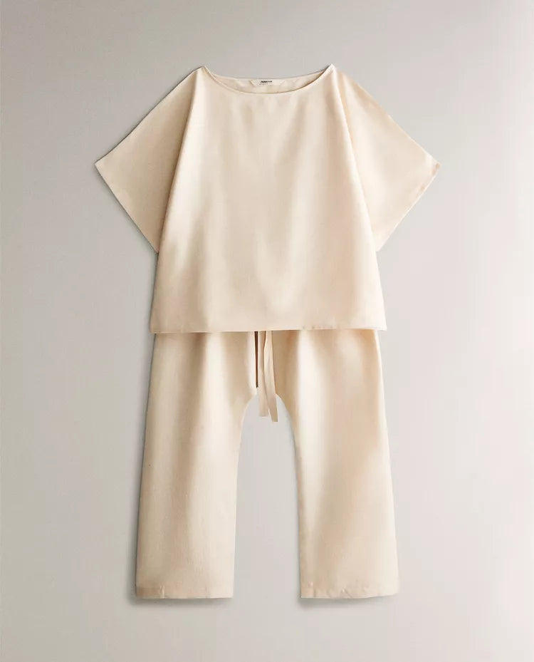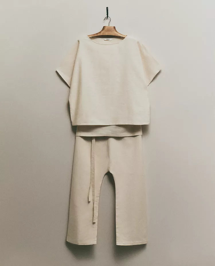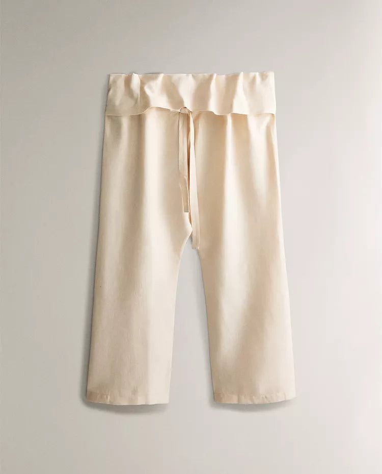 Calças de cintura baixa em linho de cor lisa com fita ajustável à cintura.Inclui um saco com fecho de fitas... Read more