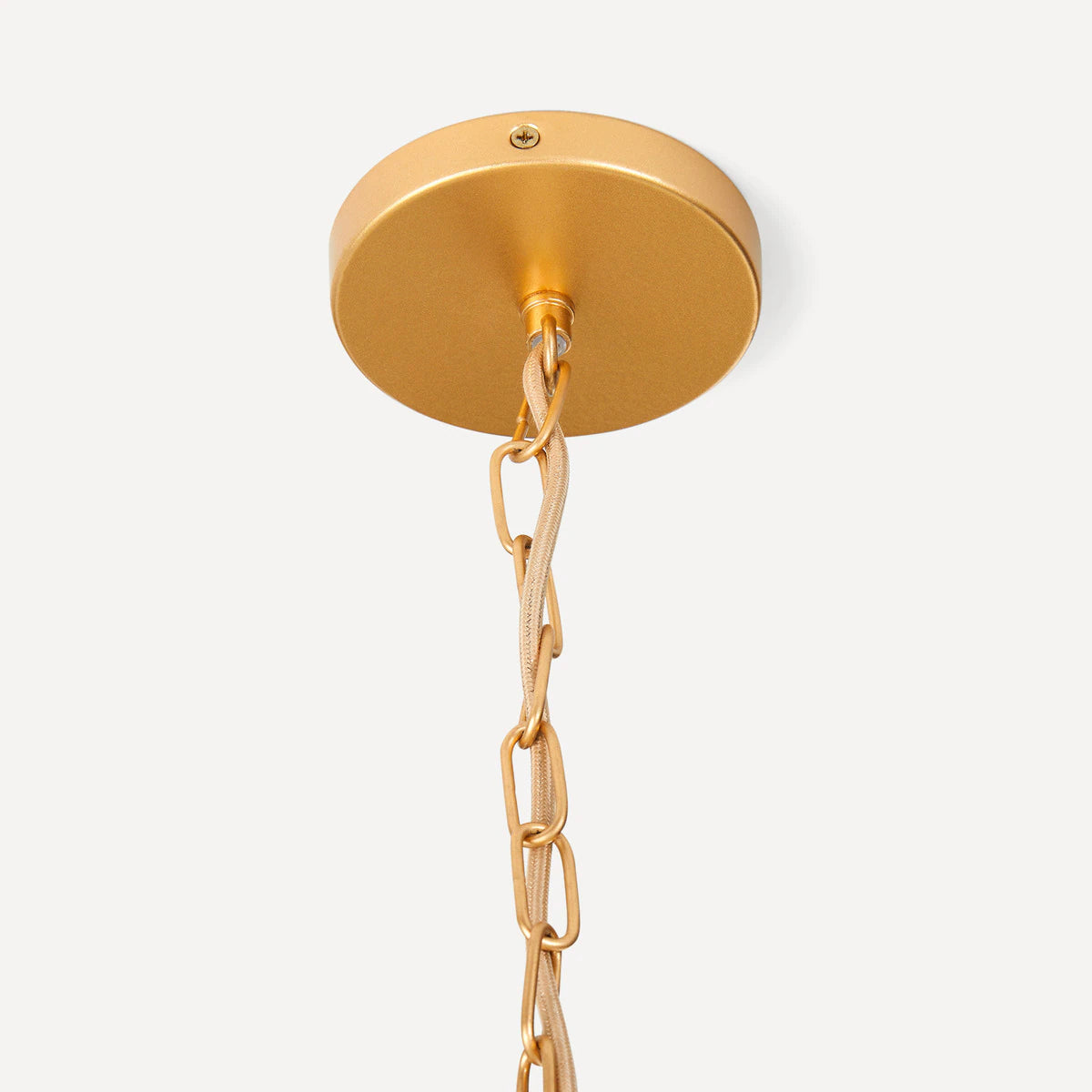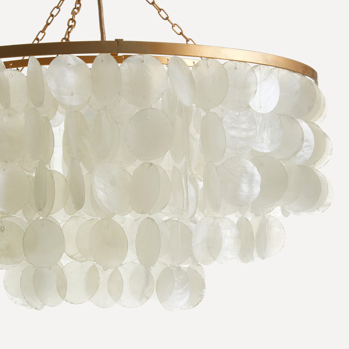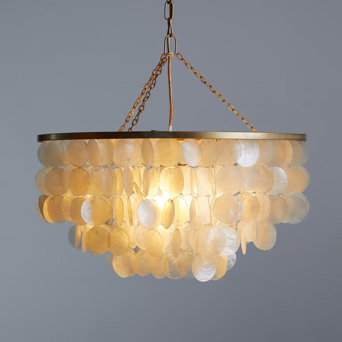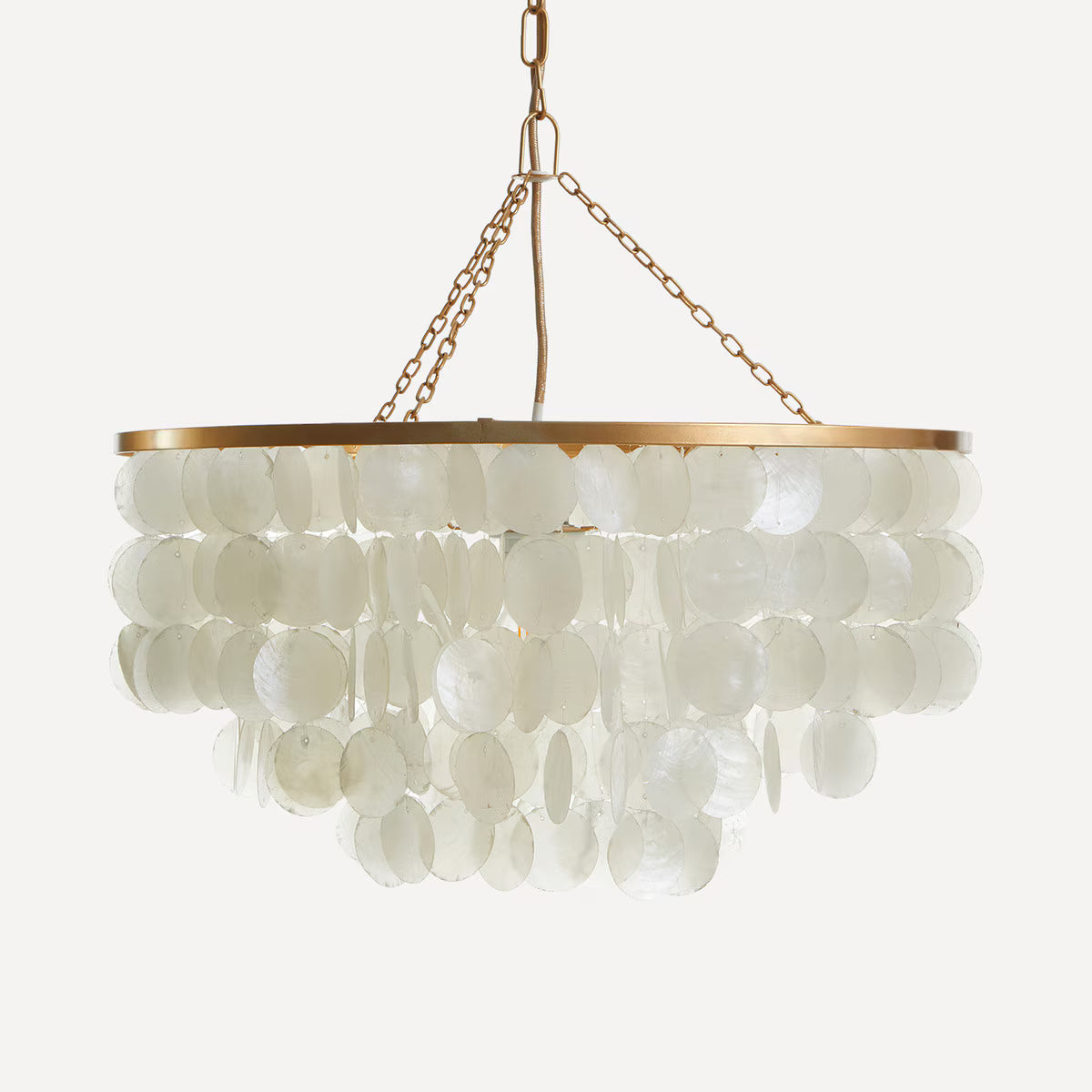 Candeeiro de teto com uma estrutura composta por três aros metálicos que penduram filas de conchas capiz, um material que tira o seu nome da região filipina de onde provém e que conhecemos como nácar ou madrepérola. É um material sustentável com um grande valor tradicional devido à natureza artesanal da sua produção.