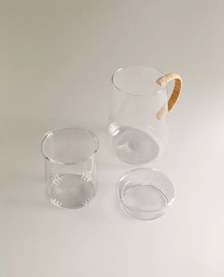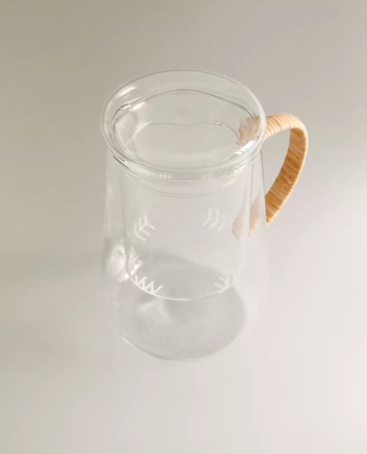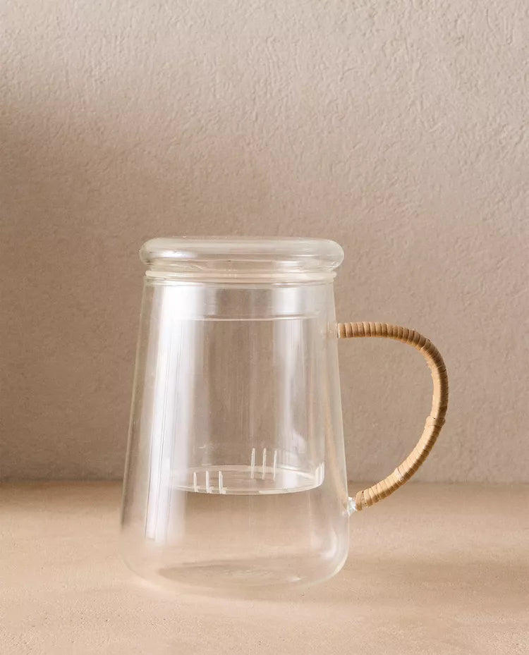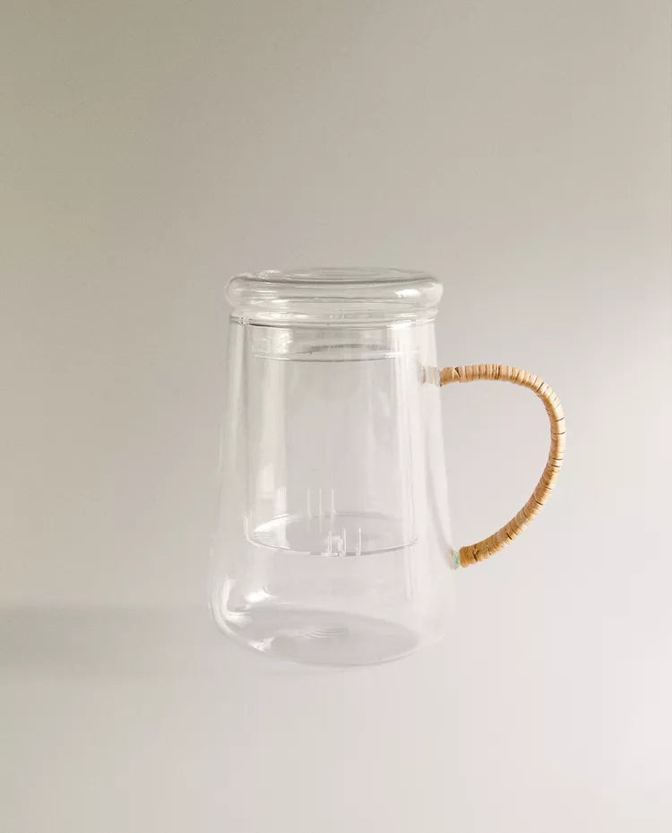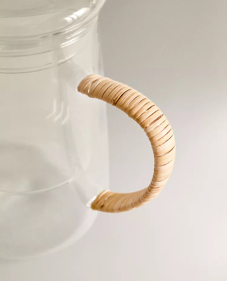 Caneca com tampa em vidro com asa com ratã e infusor no interior. Altura Largura Profundidade 14.4cm 10cm 10cm Read more