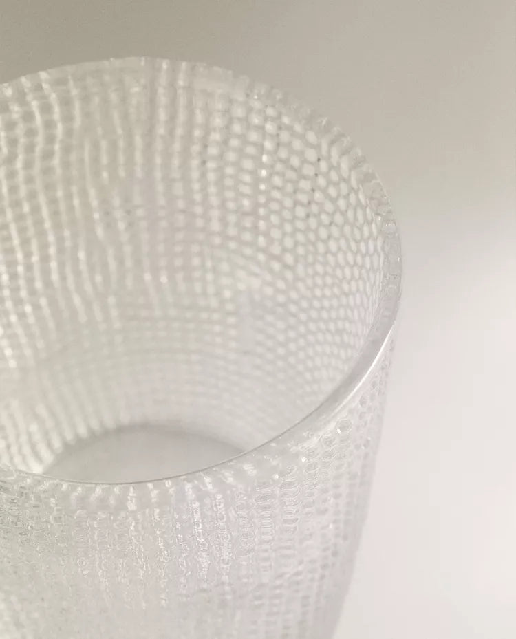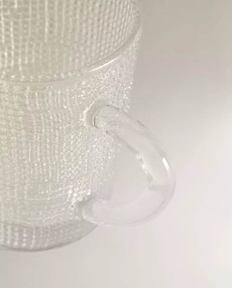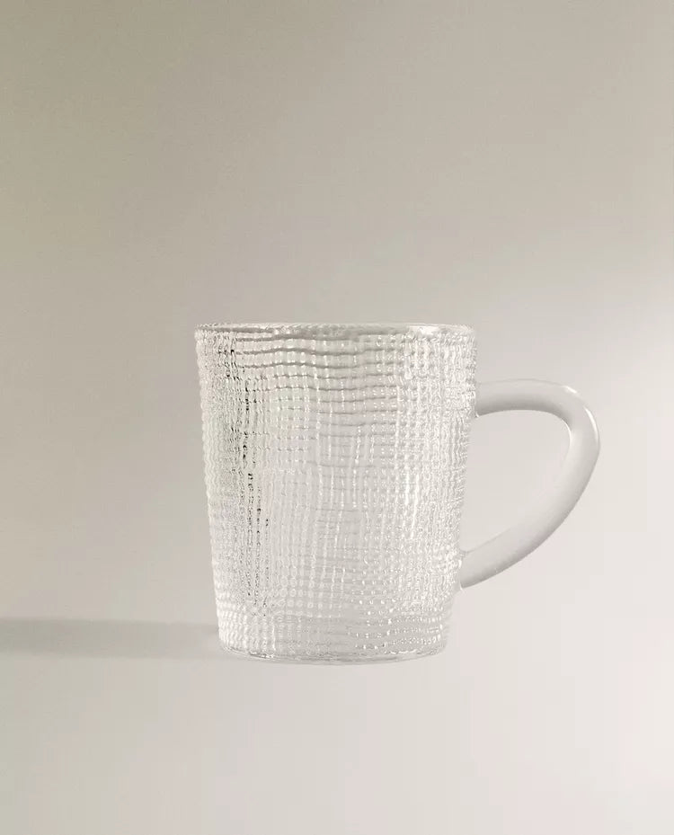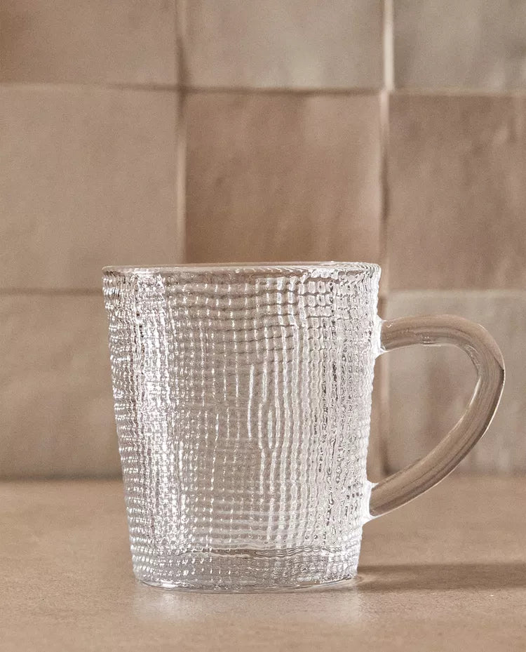 Caneca de vidro transparente com relevo. Capacidade: 350 ml Altura Largura Profundidade 9.5cm 12cm 8.5cm Read more