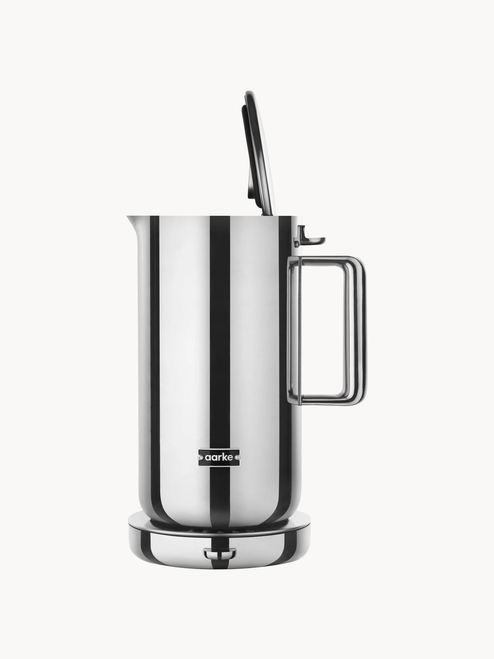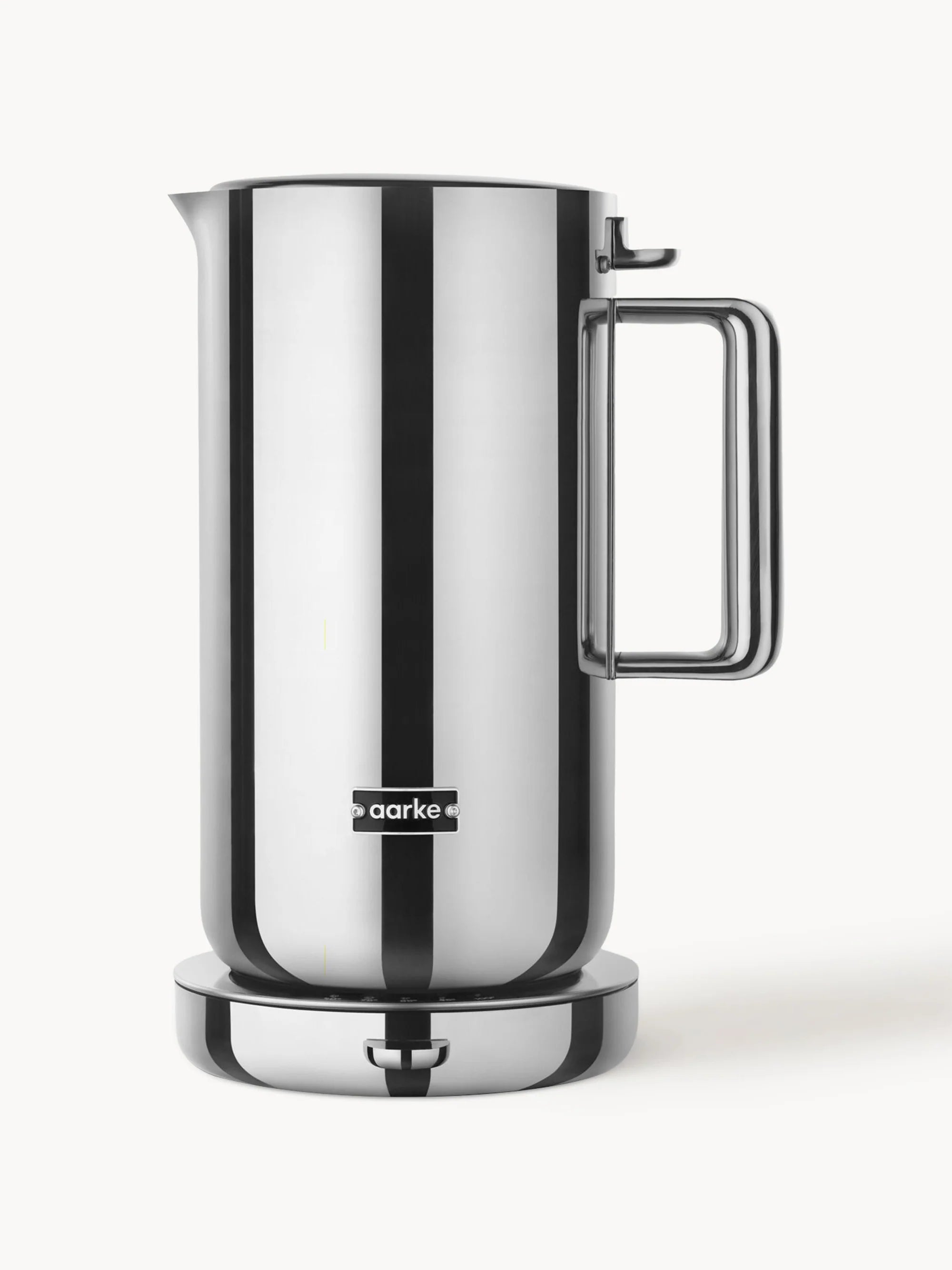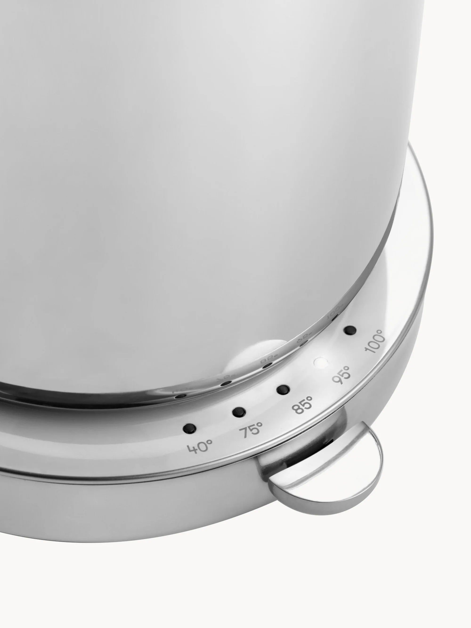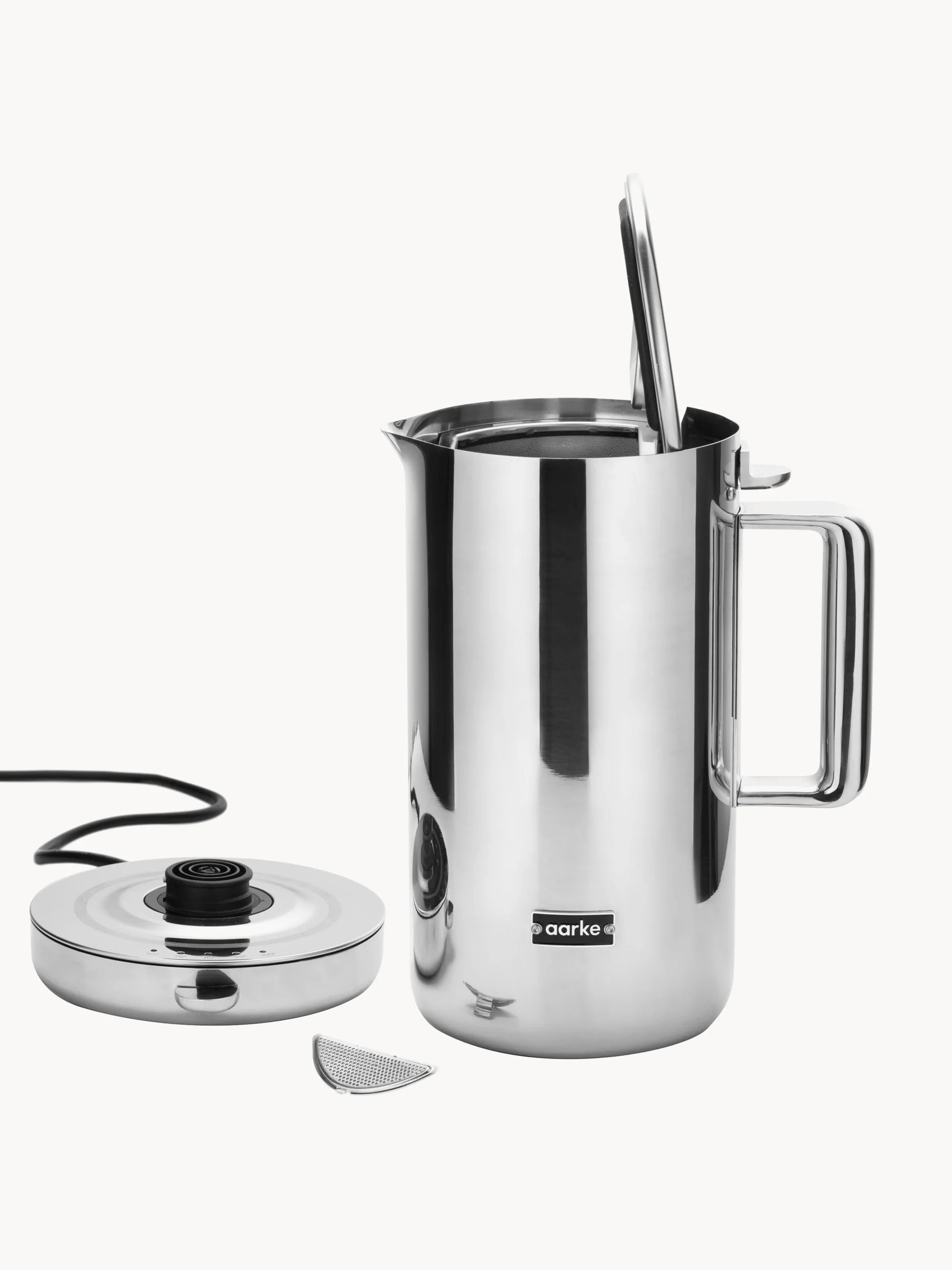 A chaleira elétrica Aarke Kettle tem um controlo de temperatura que permite várias definições de temperatura de 40°C a 100°C, bem como um prático indicador LED de arrefecimento. Fabricada em aço inoxidável com uma pega resistente ao calor, esta chaleira combina funcionalidade, design e engenharia. Se a sua água tiver um elevado teor de calcário, pode combinar a chaleira com os jarros de filtro de água Purifier para evitar a descalcificação frequente. A chaleira impressiona com a sua tecnologia precisa: o bico sem gotejamento garante um derramamento perfeito e uma fácil utilização, enquanto a tampa abre suavemente para evitar salpicos de água quente. Para uma maior segurança, a função de proteção contra cozedura a seco desliga automaticamente a chaleira quando há pouca água ou esta está completamente vazia. Graças à sua construção de parede dupla isolante, a chaleira Aarke é particularmente eficiente em termos de energia e muito silenciosa durante a operação. As várias definições de temperatura - 40°C, 75°C, 85°C, 95°C e 100°C - permitem uma utilização individual. Além disso, a chaleira tem uma função de memória que recorda a última definição selecionada, proporcionando assim um conforto adicional.