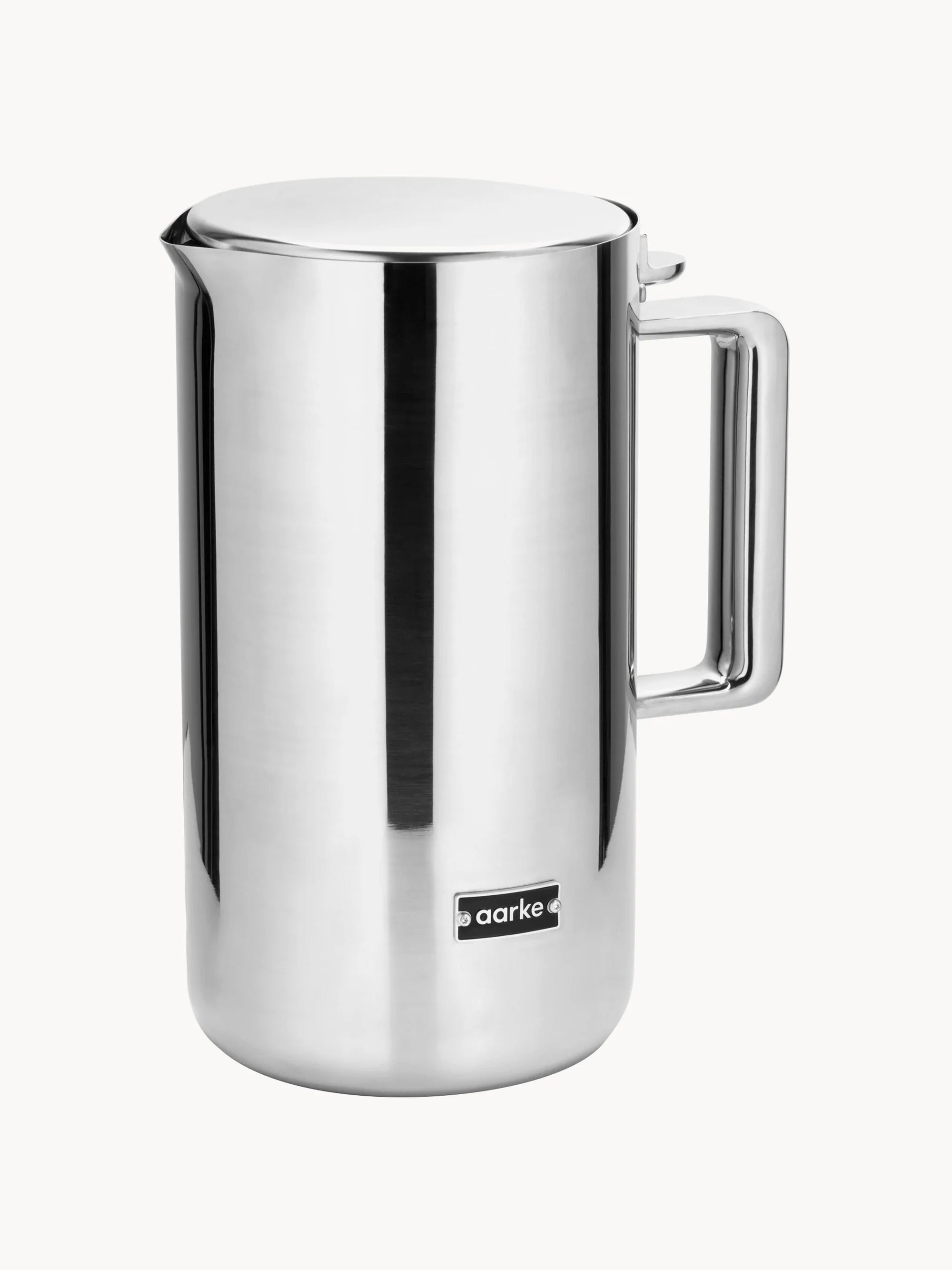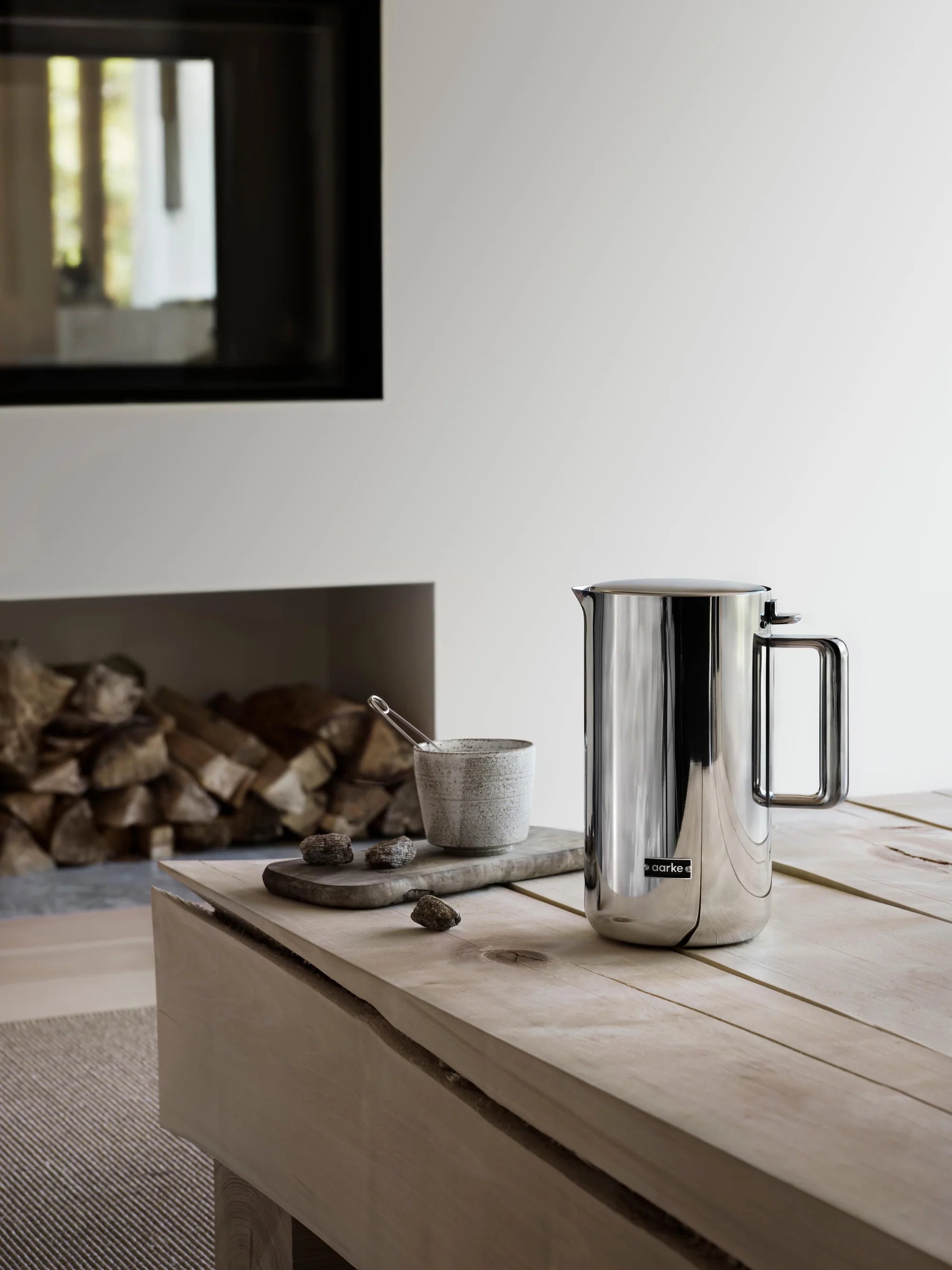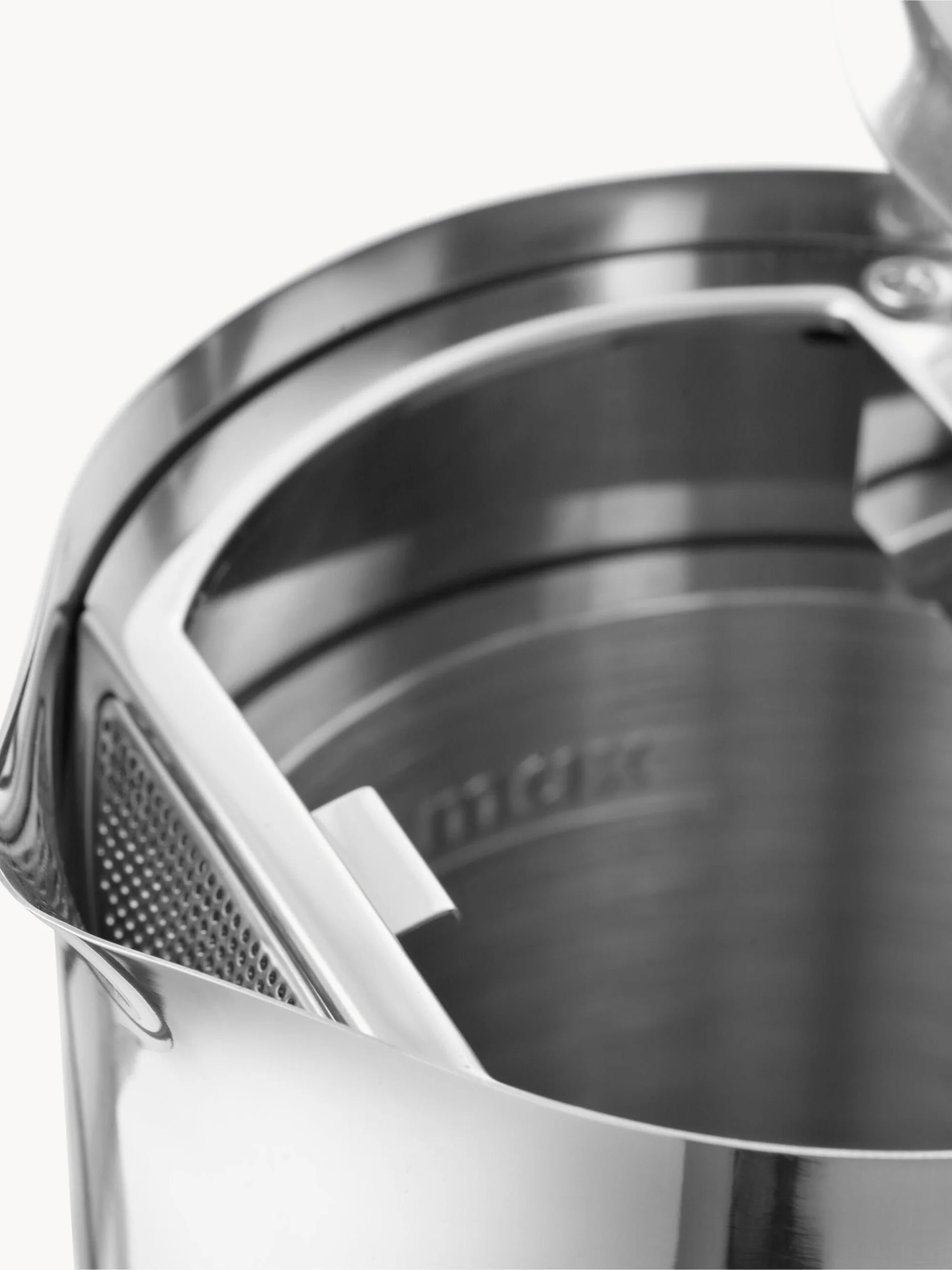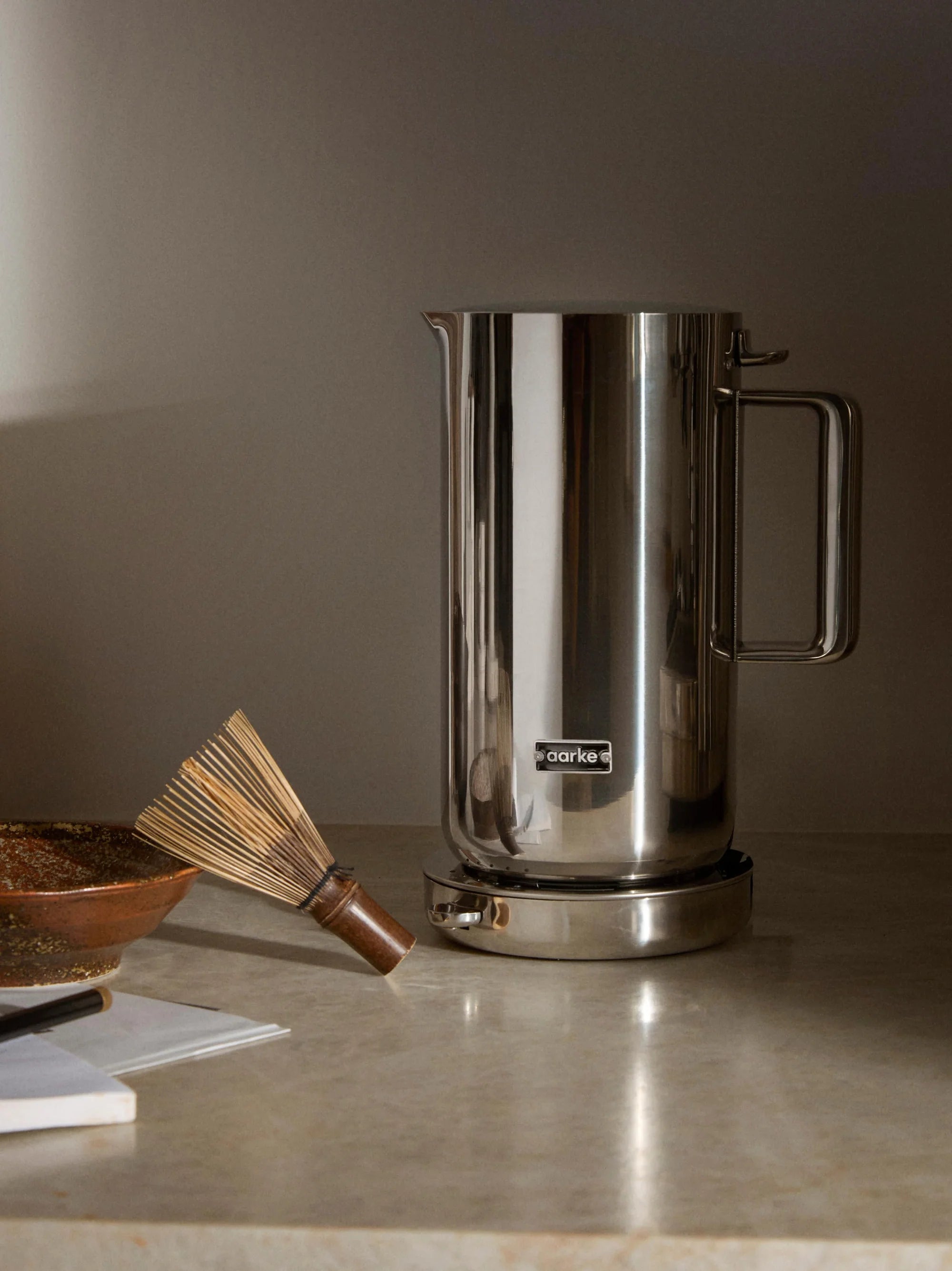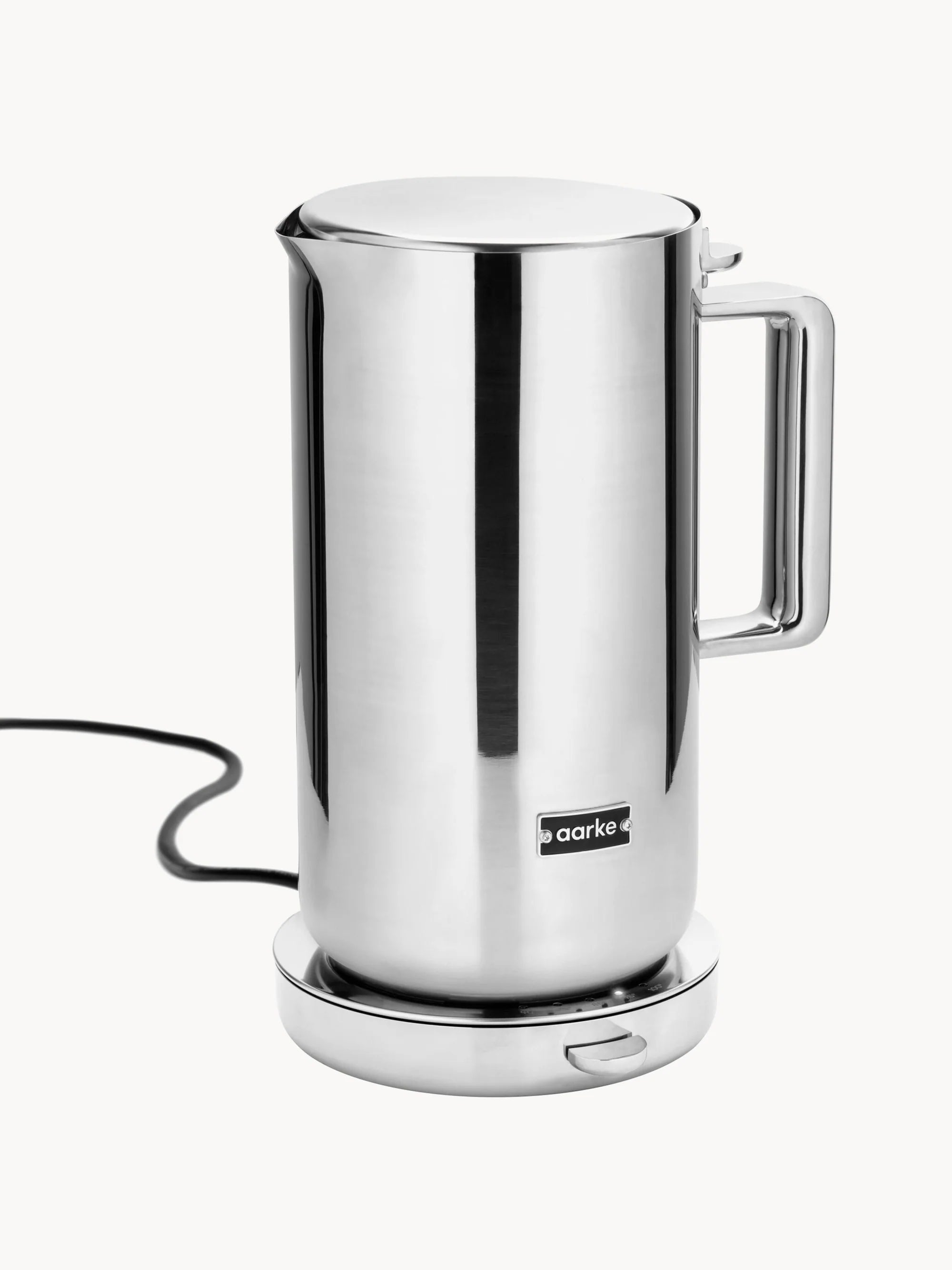 A chaleira elétrica Aarke Kettle tem um controlo de temperatura que permite várias definições de temperatura de 40°C a 100°C, bem como um prático indicador LED de arrefecimento. Fabricada em aço inoxidável com uma pega resistente ao calor, esta chaleira combina funcionalidade, design e engenharia. Se a sua água tiver um elevado teor de calcário, pode combinar a chaleira com os jarros de filtro de água Purifier para evitar a descalcificação frequente. A chaleira impressiona com a sua tecnologia precisa: o bico sem gotejamento garante um derramamento perfeito e uma fácil utilização, enquanto a tampa abre suavemente para evitar salpicos de água quente. Para uma maior segurança, a função de proteção contra cozedura a seco desliga automaticamente a chaleira quando há pouca água ou esta está completamente vazia. Graças à sua construção de parede dupla isolante, a chaleira Aarke é particularmente eficiente em termos de energia e muito silenciosa durante a operação. As várias definições de temperatura - 40°C, 75°C, 85°C, 95°C e 100°C - permitem uma utilização individual. Além disso, a chaleira tem uma função de memória que recorda a última definição selecionada, proporcionando assim um conforto adicional.