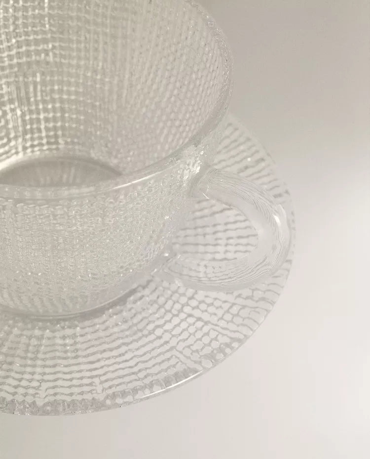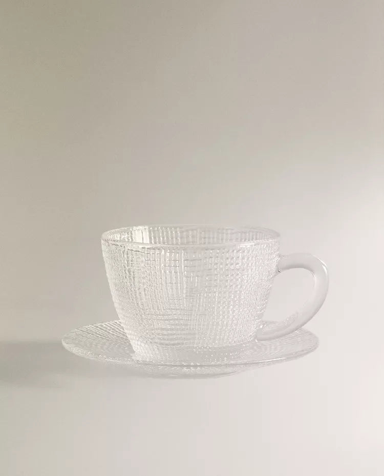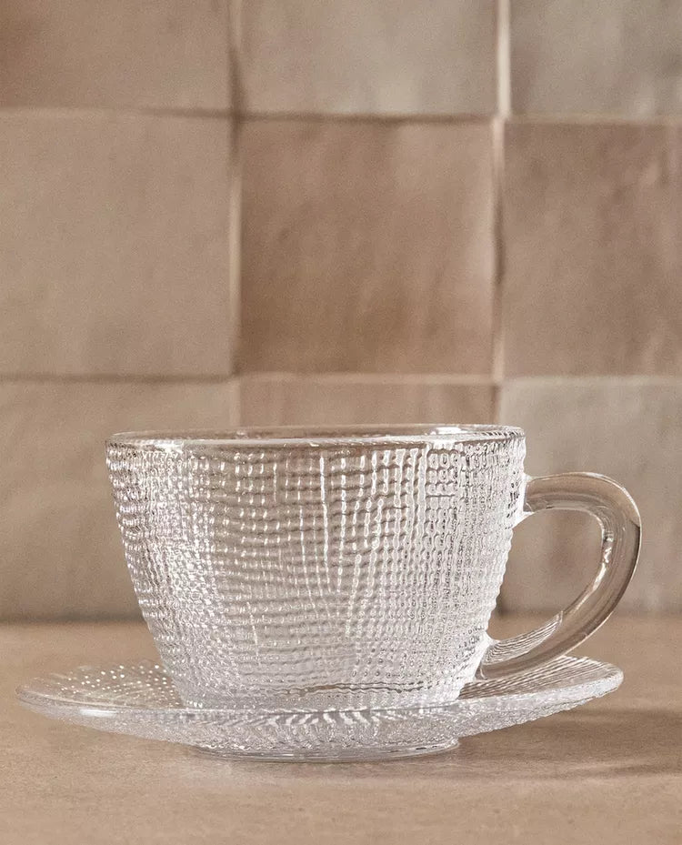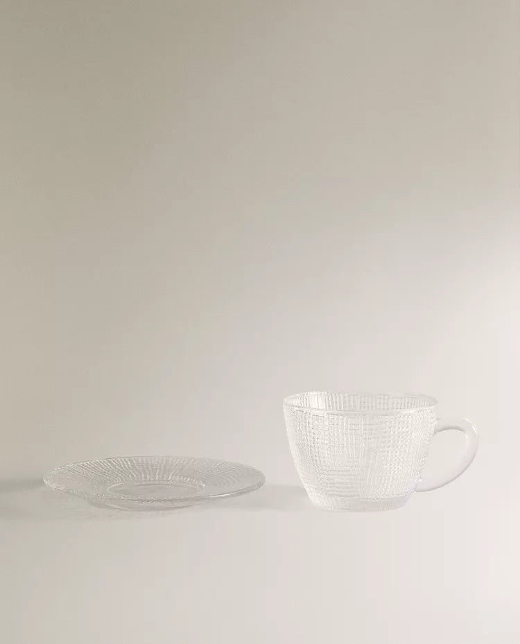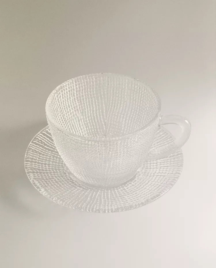 Chávena de chá com pratinho em vidro e desenho em relevo. Capacidade: 290 ml Altura Largura Profundidade 7.3cm 11cm 14cm Read more