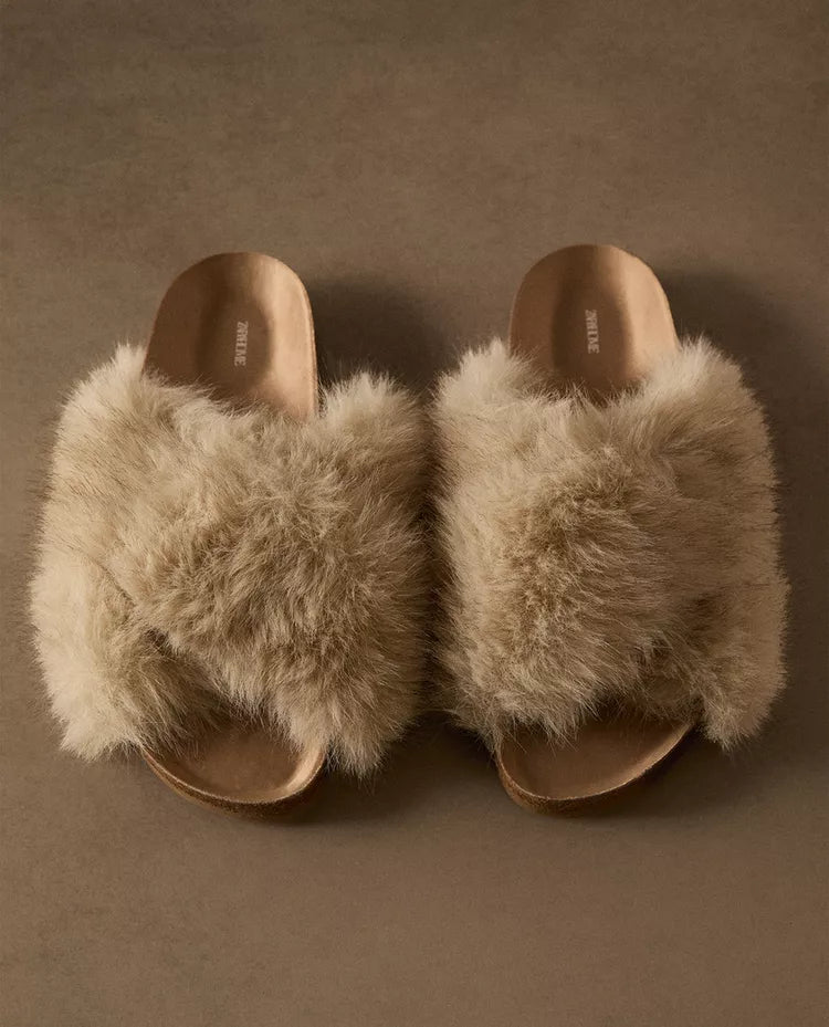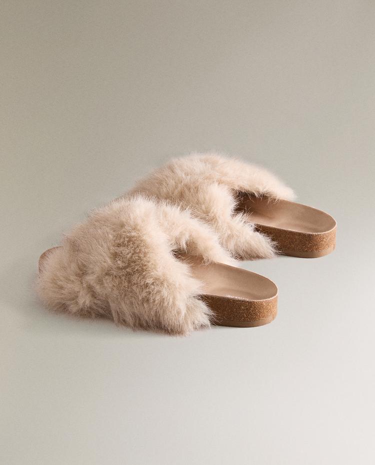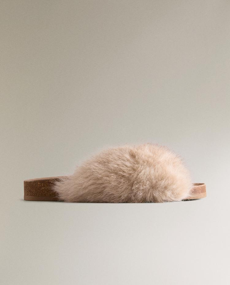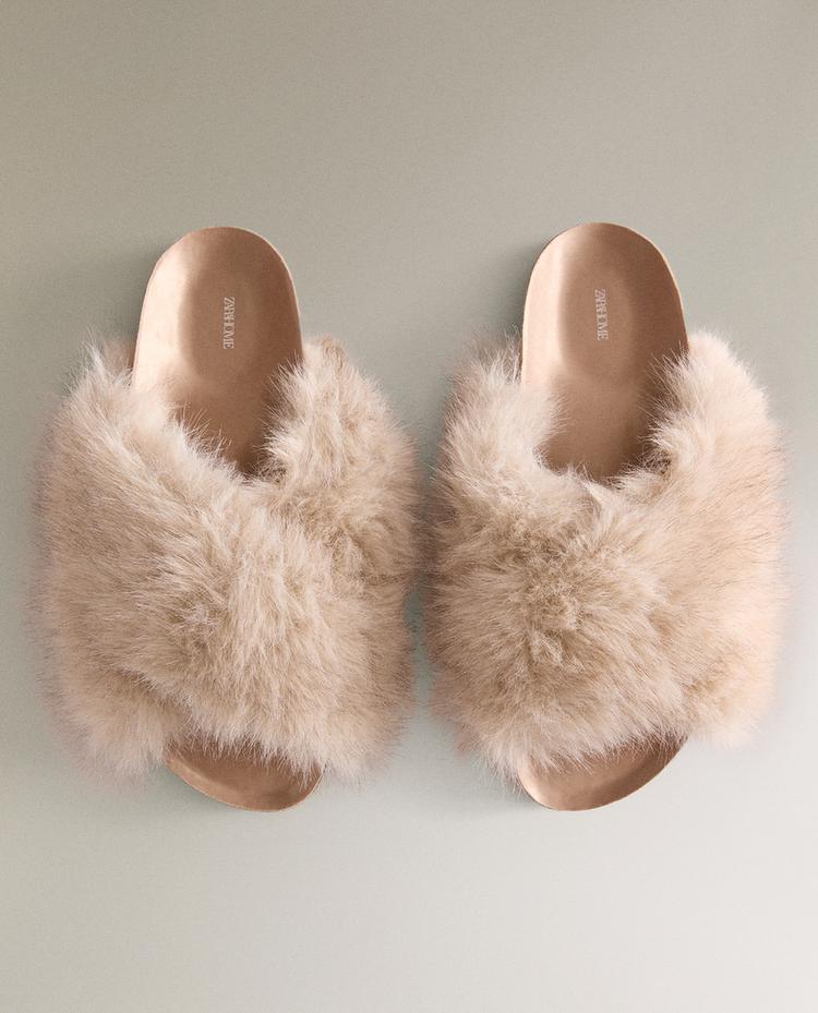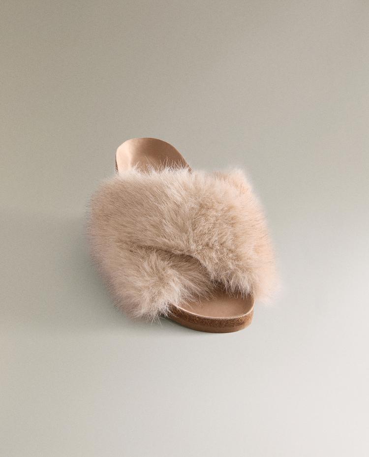 Chinelo raso com tiras cruzadas de pelo sintético. Pormenor de planta em cetim. Tamanho 35 36 37 38 Read more