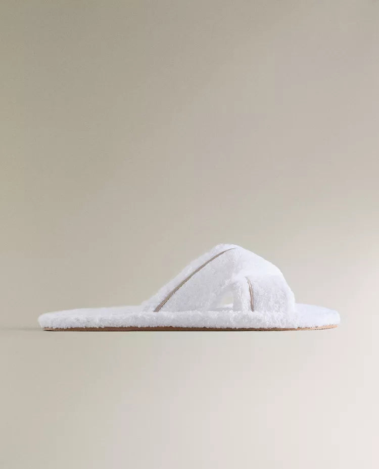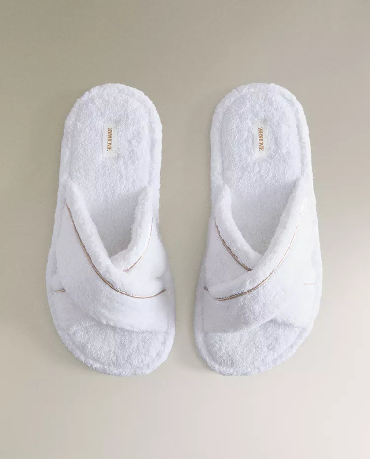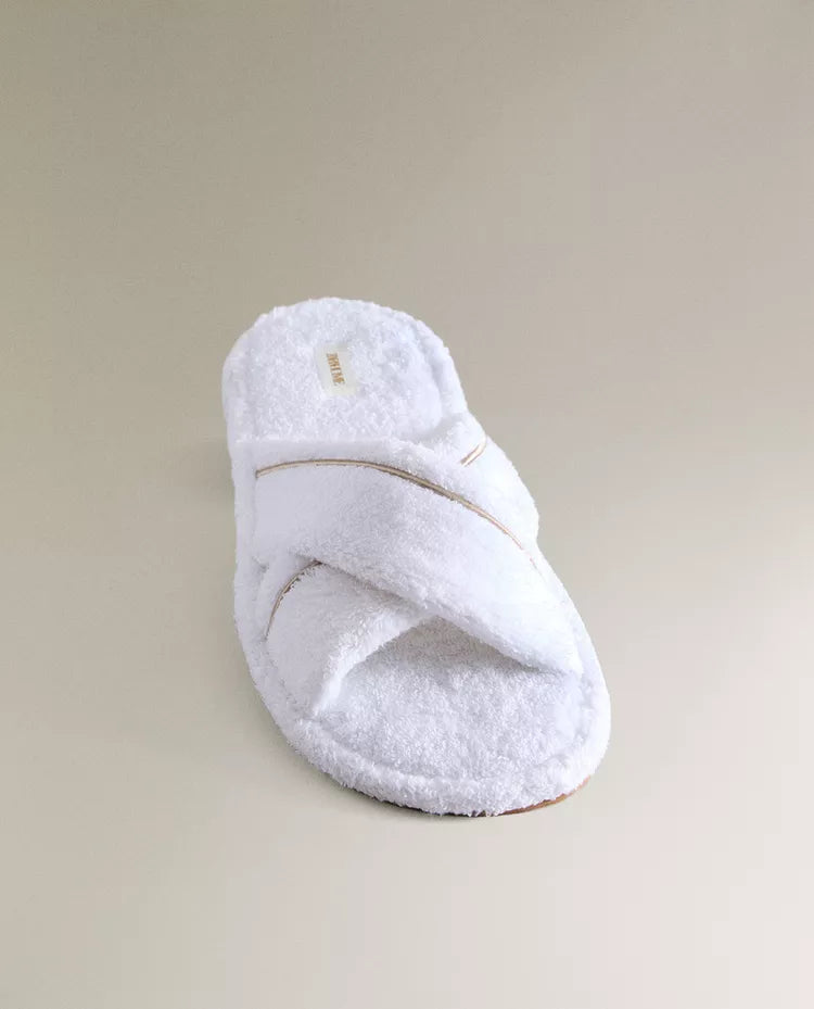 Chinelos de quarto mules 100% algodão turco. Ideais para o banho. Pormenor de tiras largas cruzadas à frente com debrum... Read more