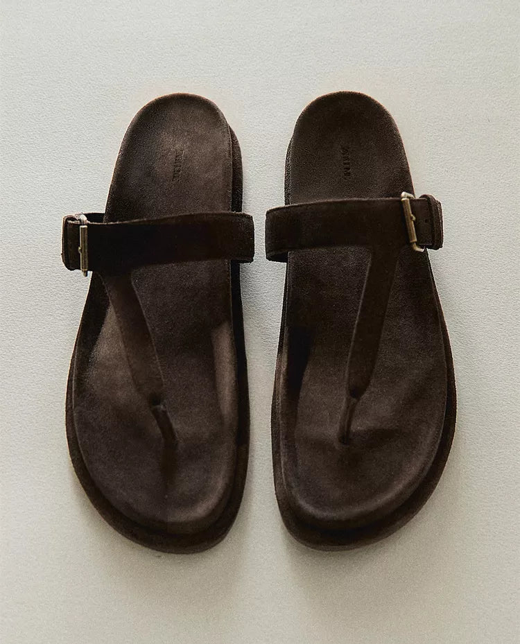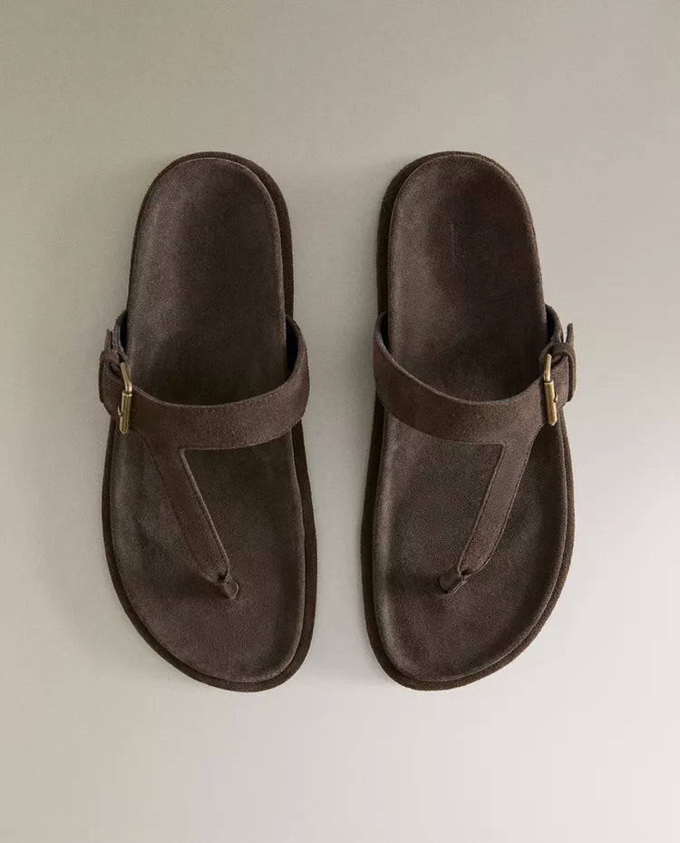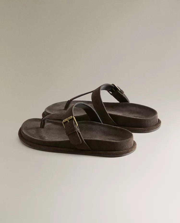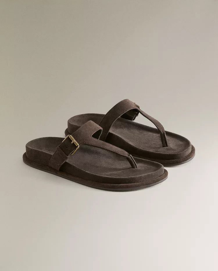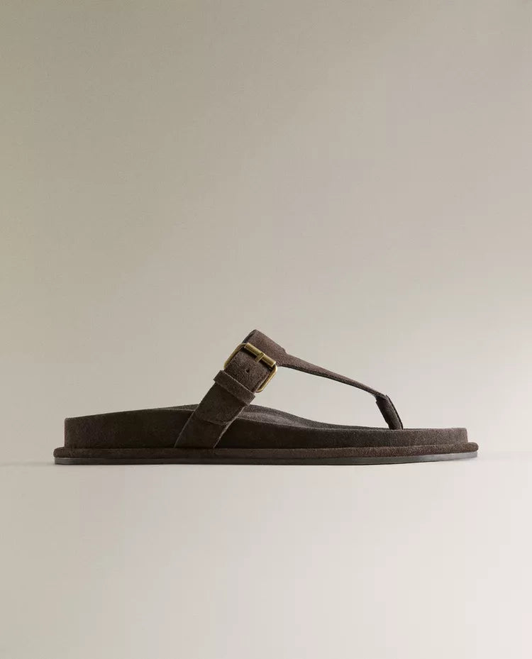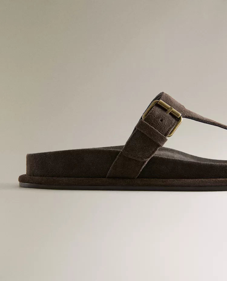 Chinelos rasos de pele com acabamento em croute. Posição para os dedos. Fecho de tira com fivela. Tamanho 35 37... Read more