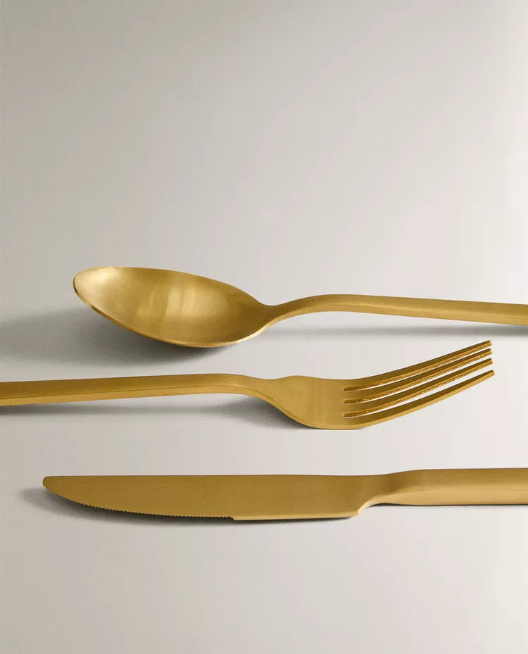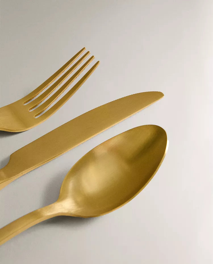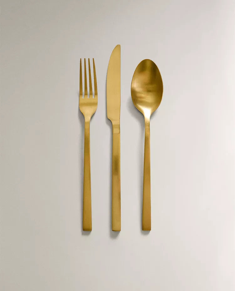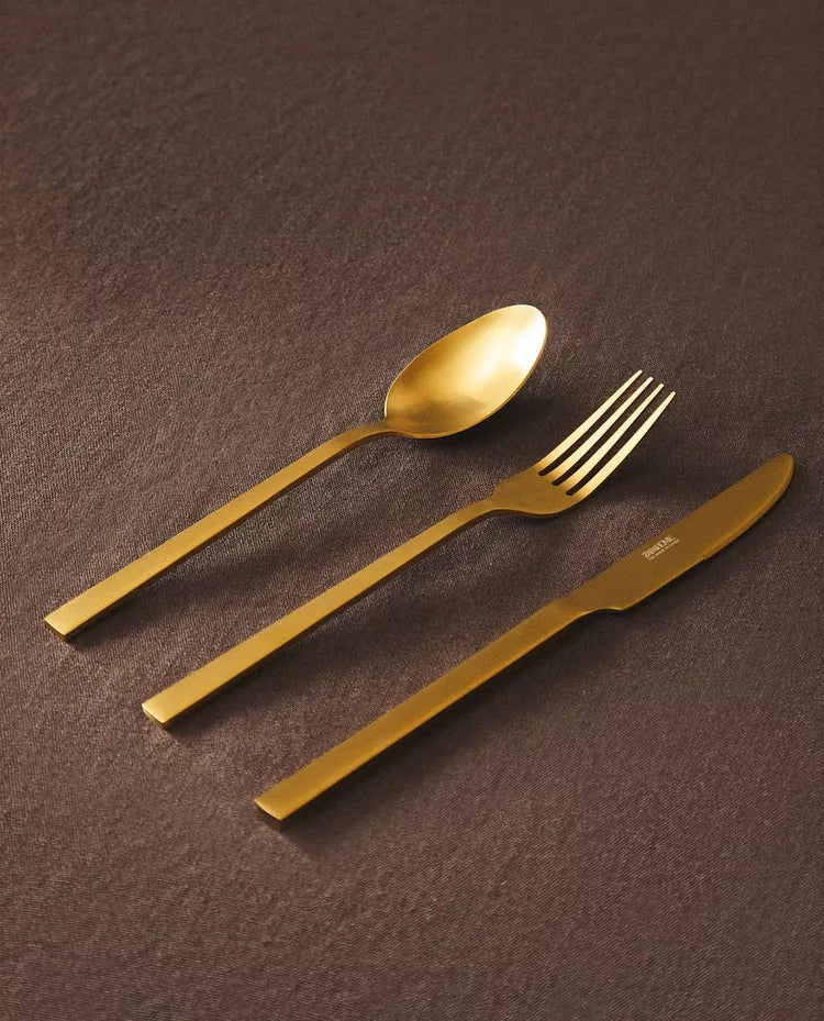 Conjunto de talheres composto por um garfo, uma faca e uma colher em aço inoxidável dourado, com acabamento mate.O conjunto... Read more