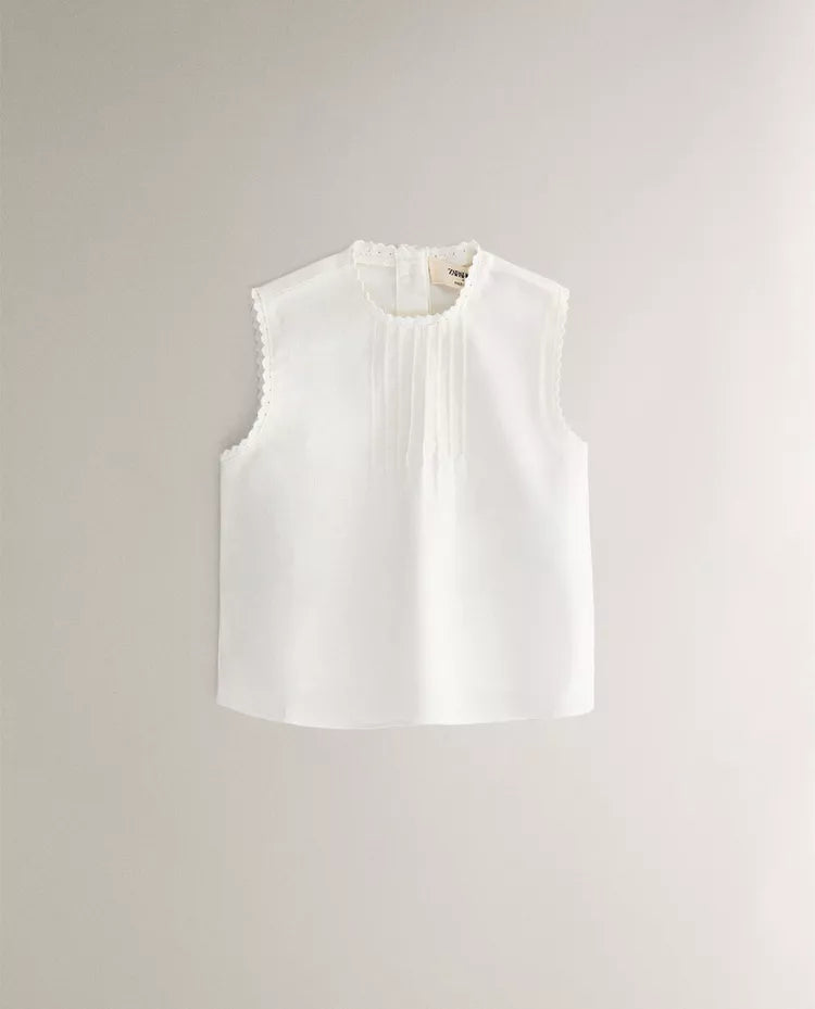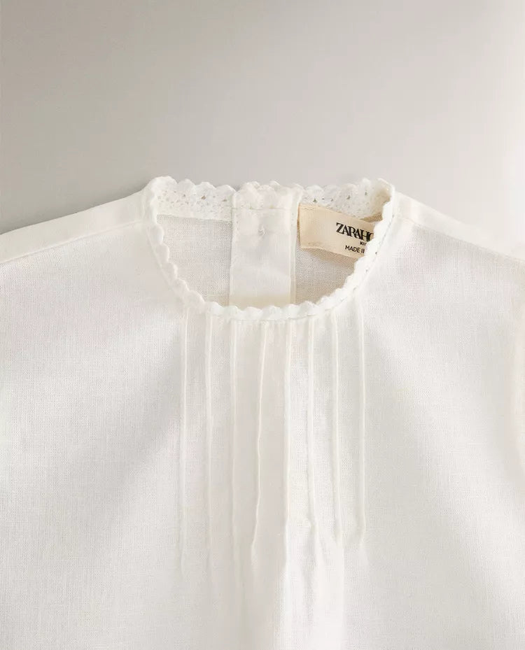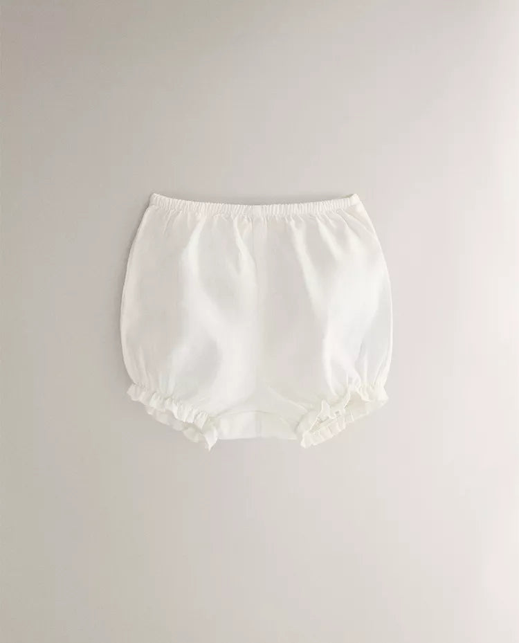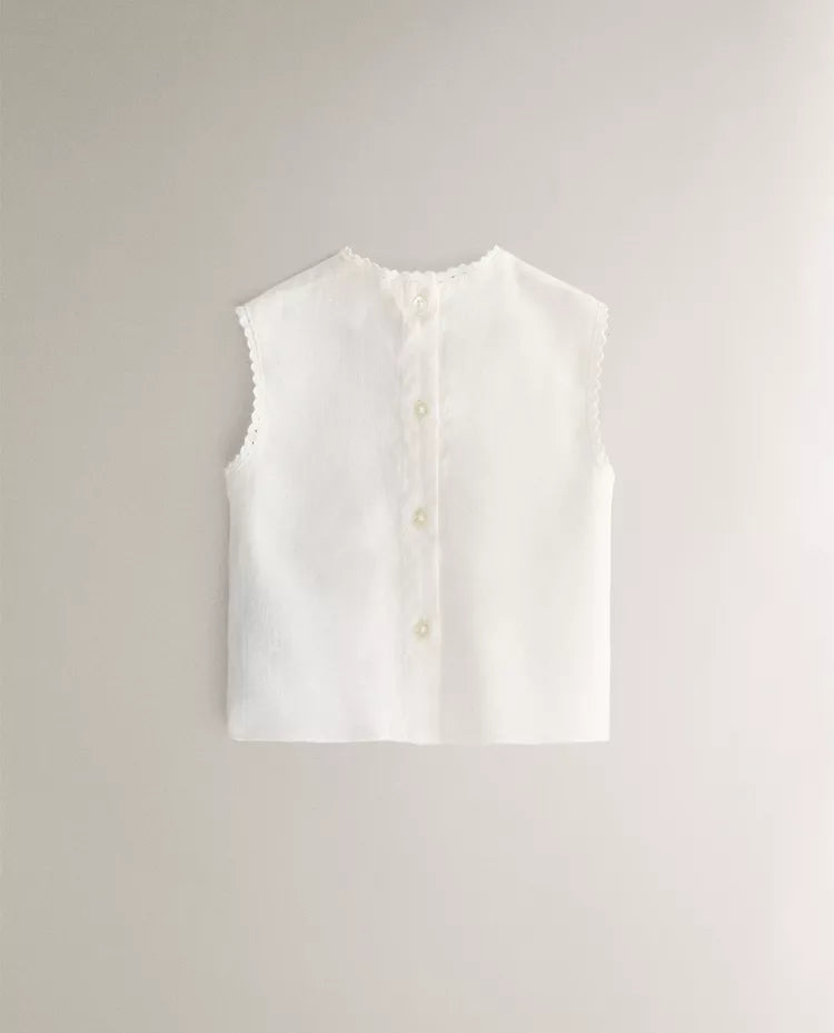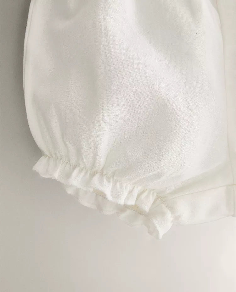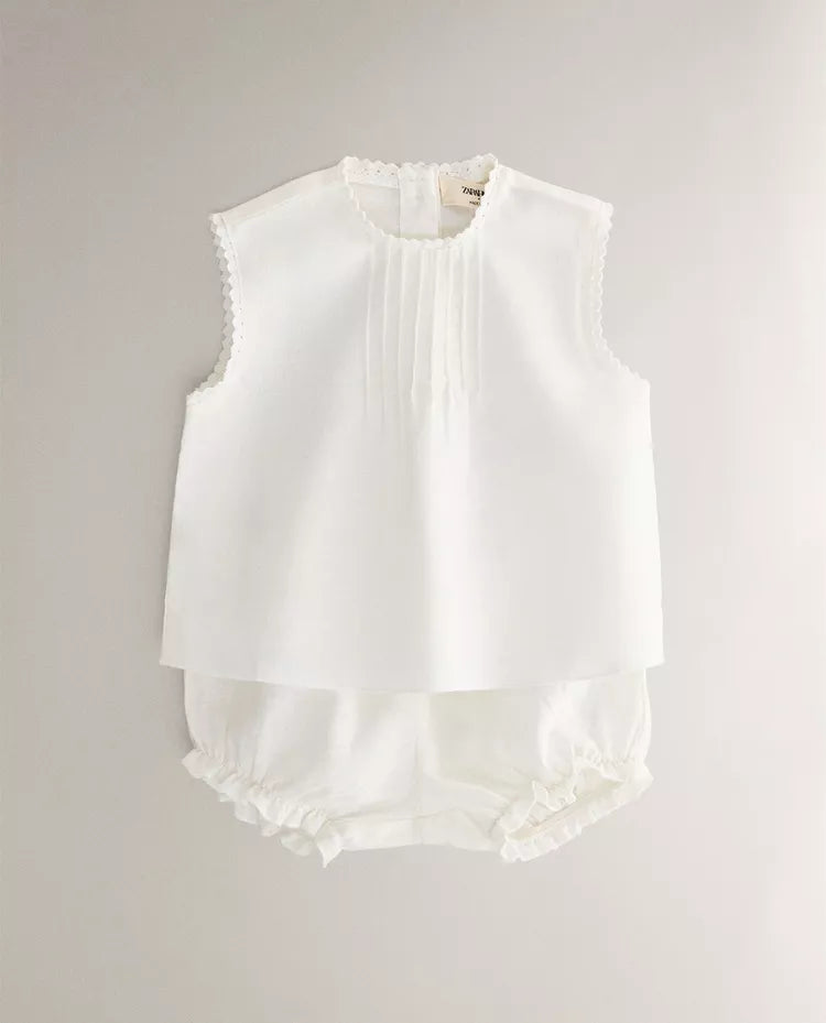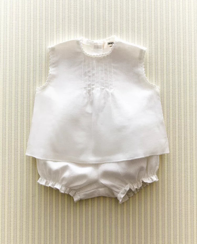 Conjunto de roupa de bebé em linho e algodão, composto por camisa sem mangas com pormenor de pregas e fecho... Read more