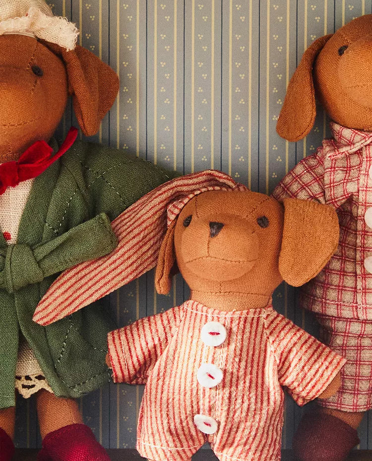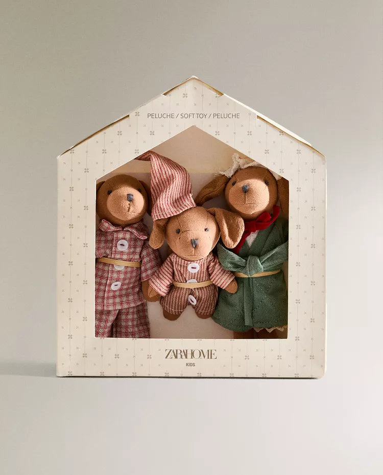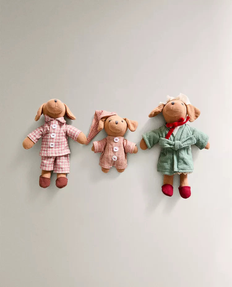 Conjunto de peluches infantis em forma de cãezinhos com pijamas e robe.O conjunto inclui 3 peluches diferentes. Altura Largura Profundidade... Read more
