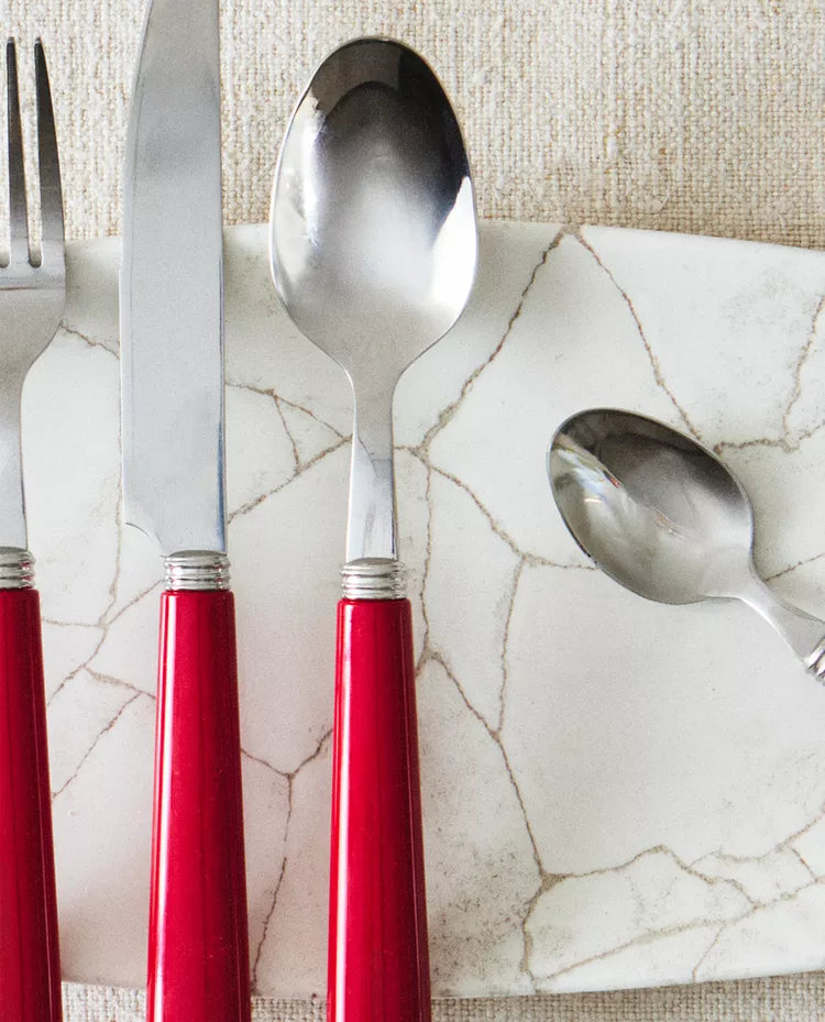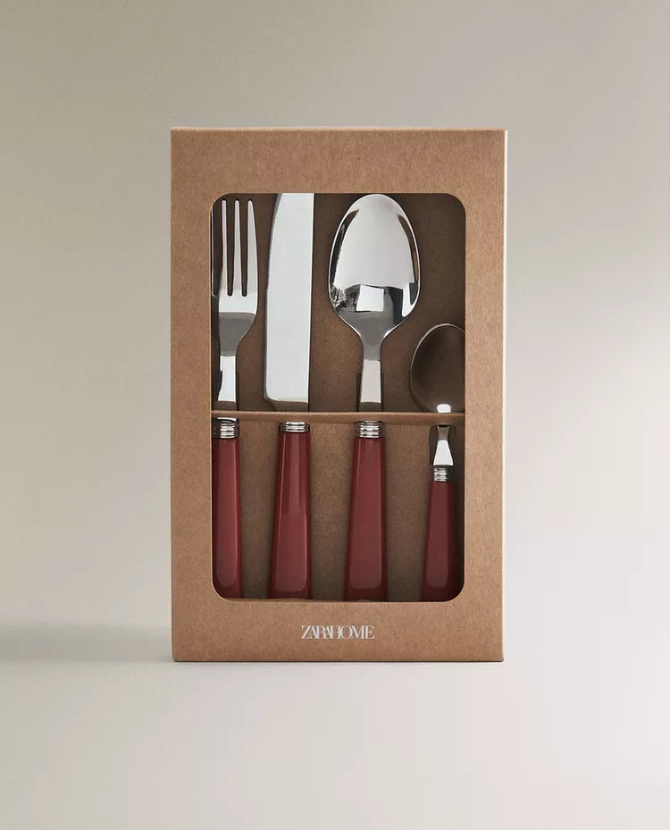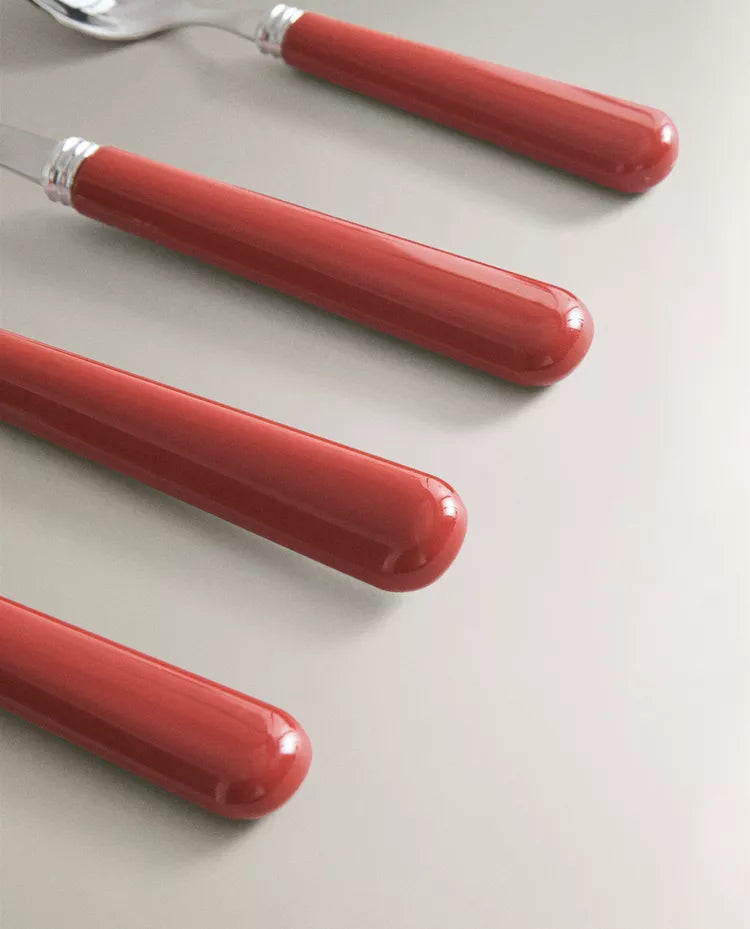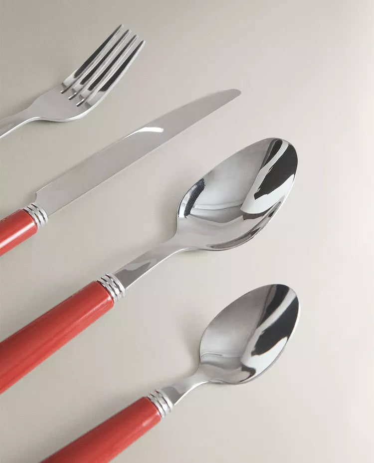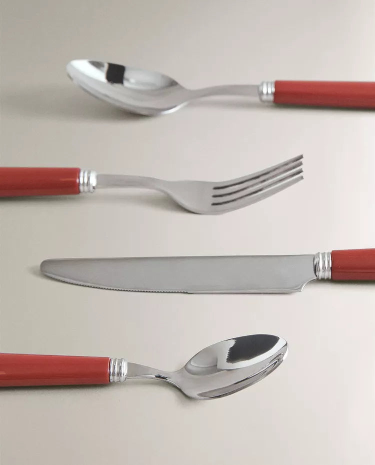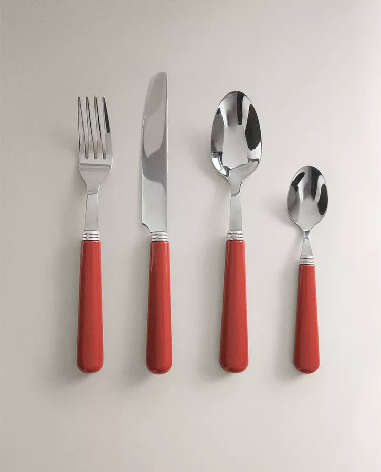 Talheres de aço inoxidável com cabo simples colorido.O conjunto inclui um garfo, uma faca, uma colher e uma colher de... Read more