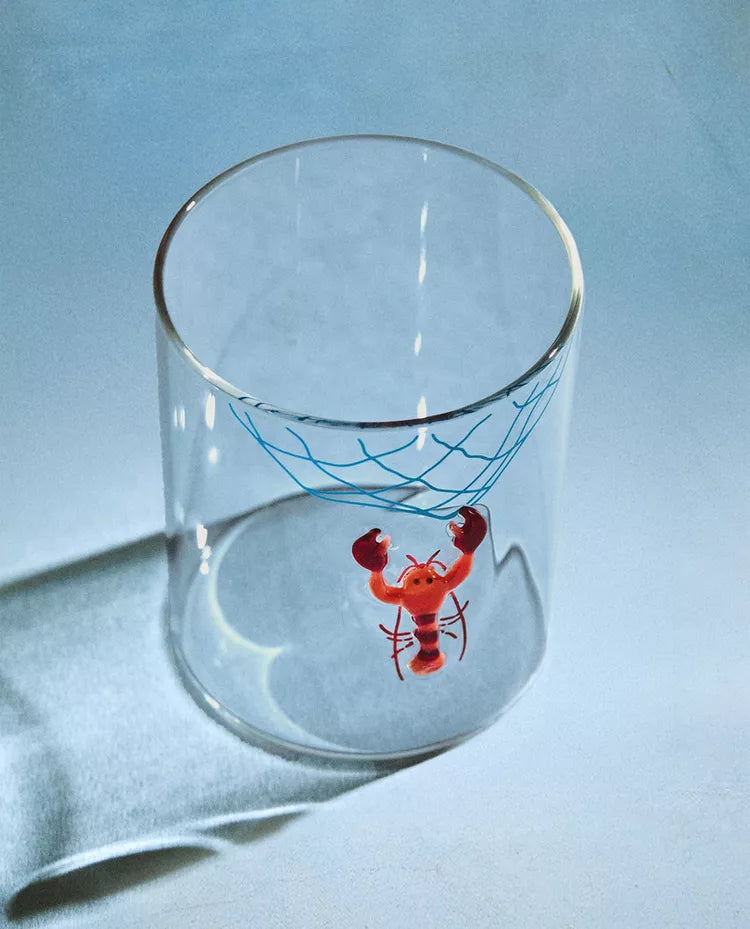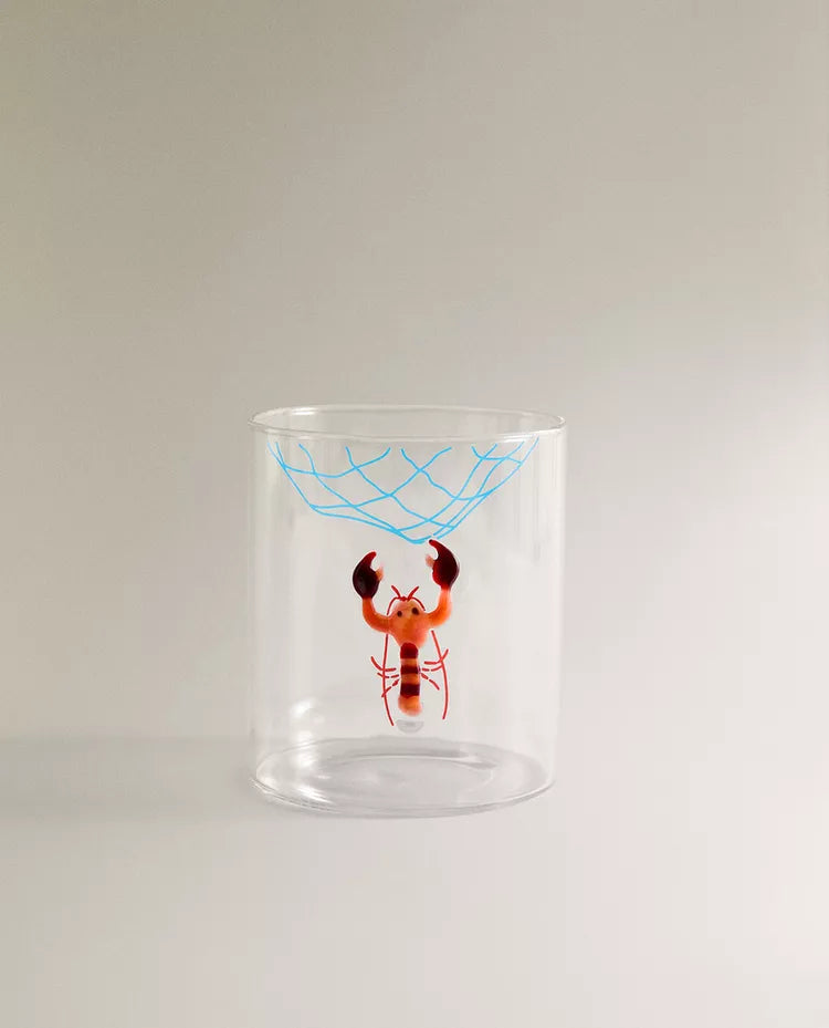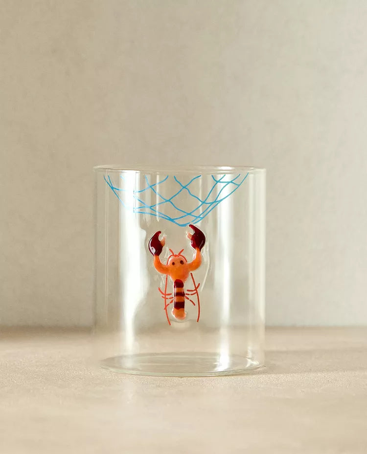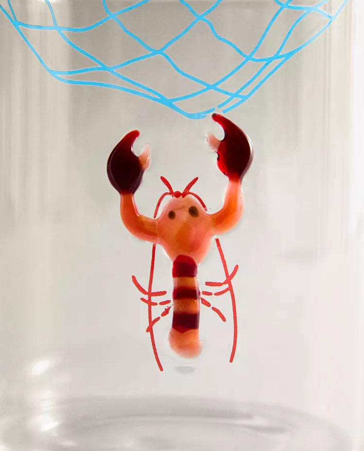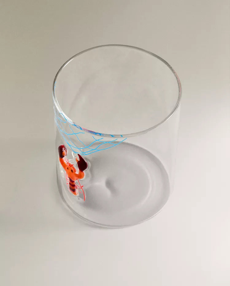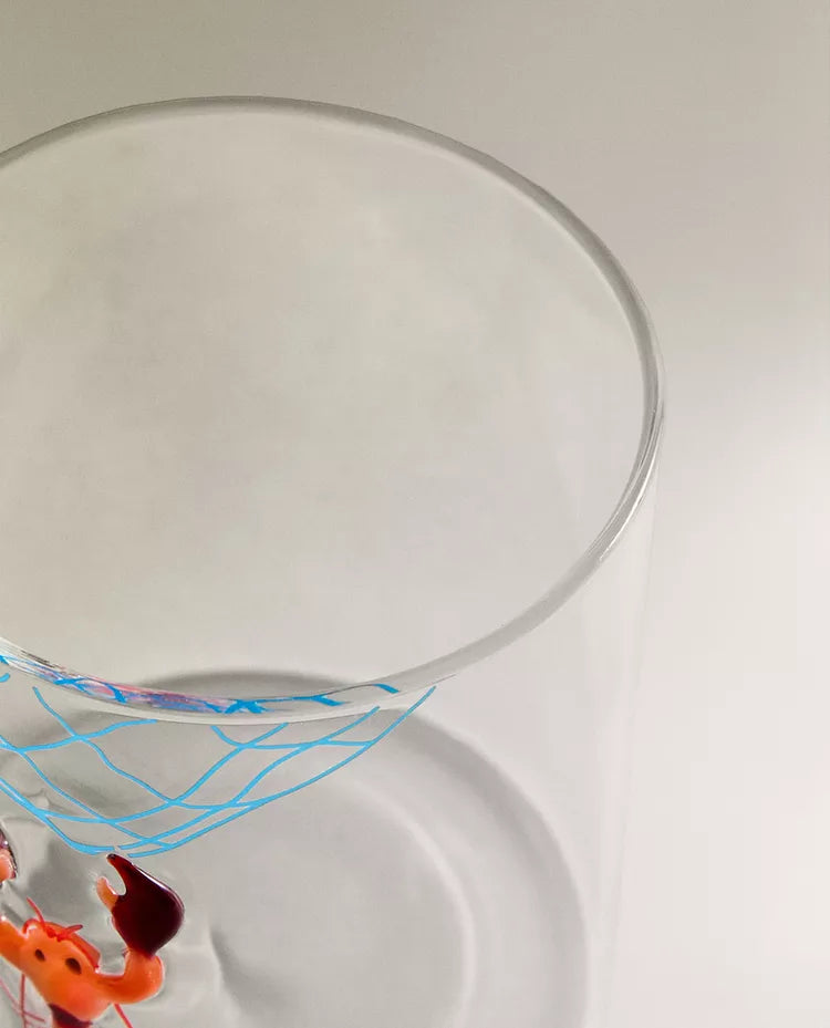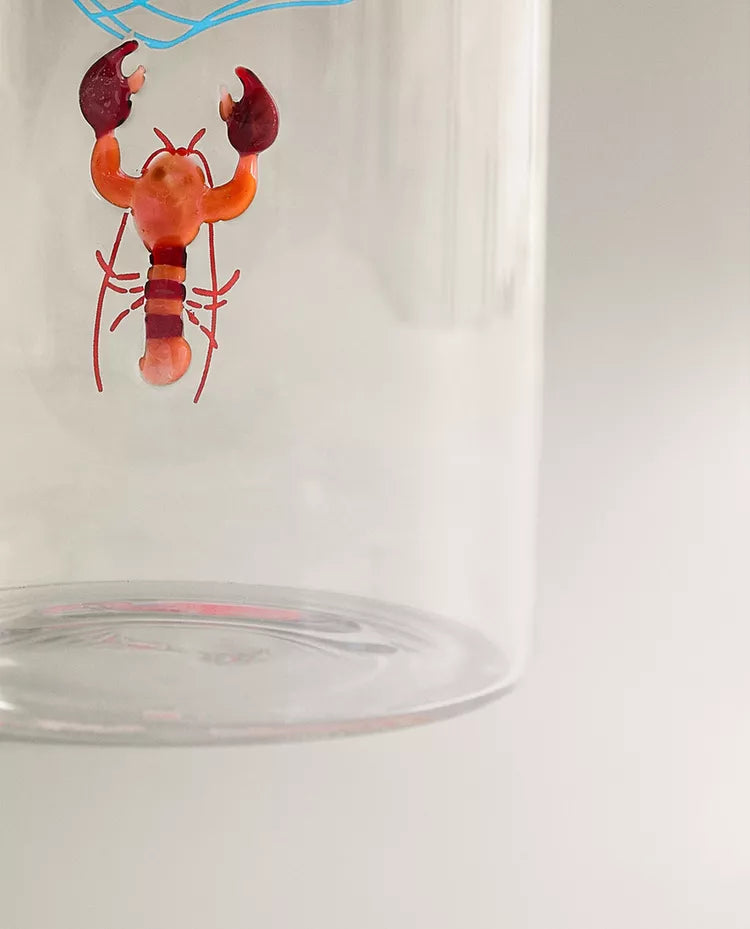Copo em borossilicato com pormenor de aplicações em relevo em forma de lagosta. Capacidade: 300 ml Altura Largura Profundidade 9.5cm 8cm... Read more