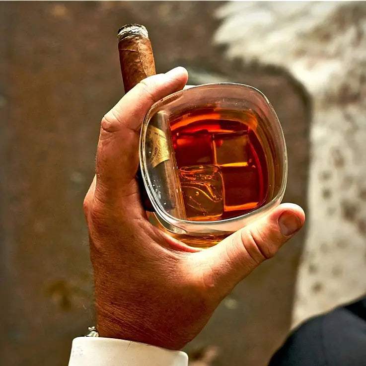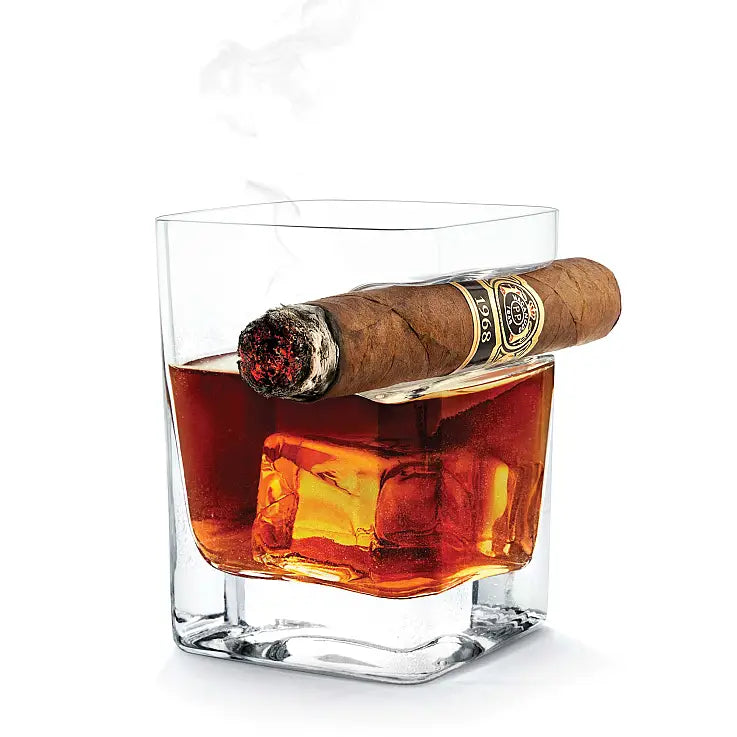 copo de whisky original, é muito mais fácil desfrutar deste trio clássico. O seu design foi concebido para colocar um charuto na fenda lateral e deixar a outra mão livre.