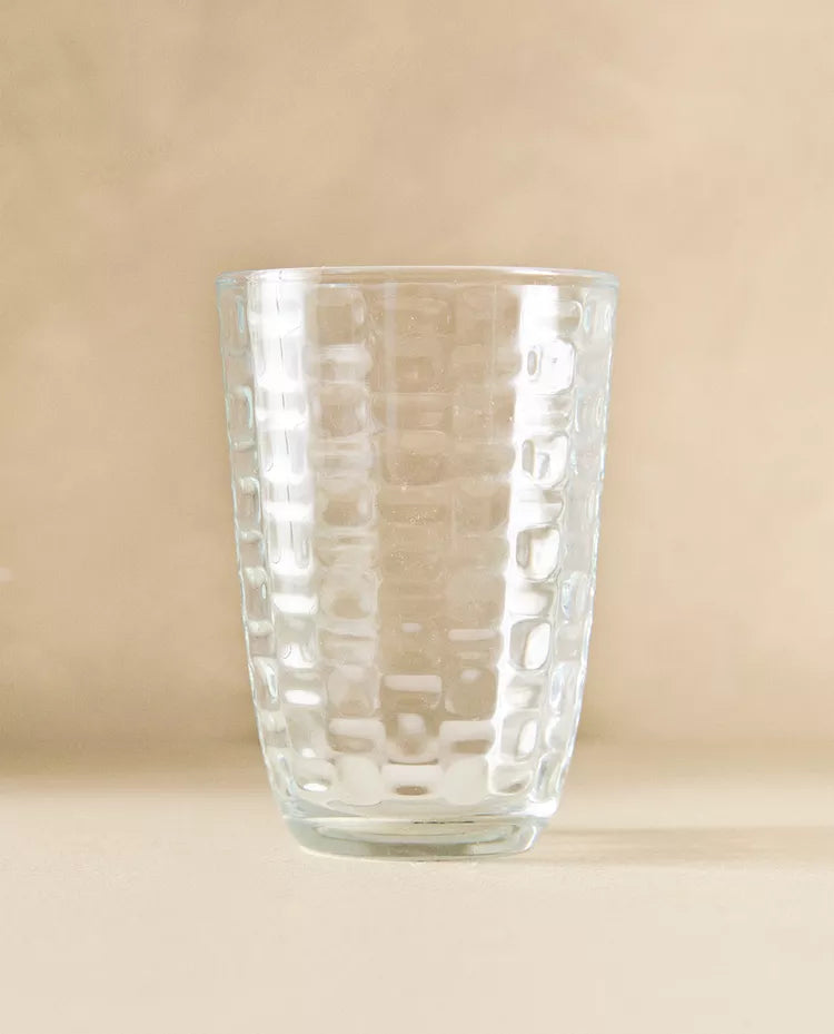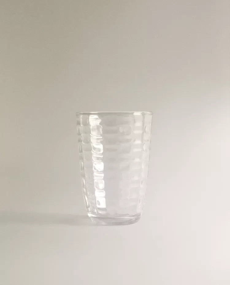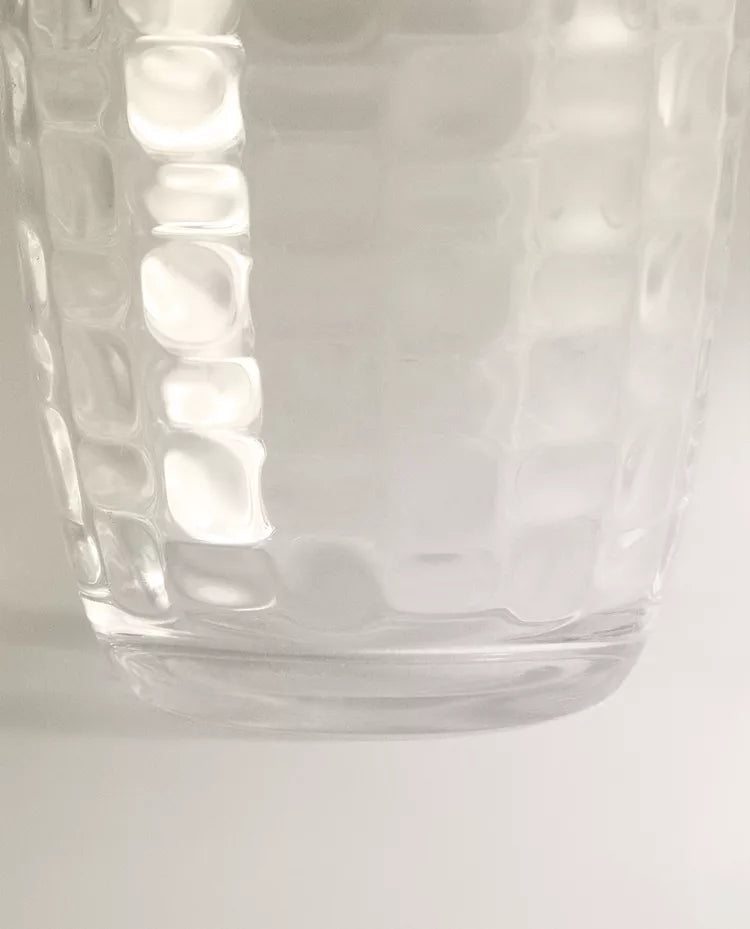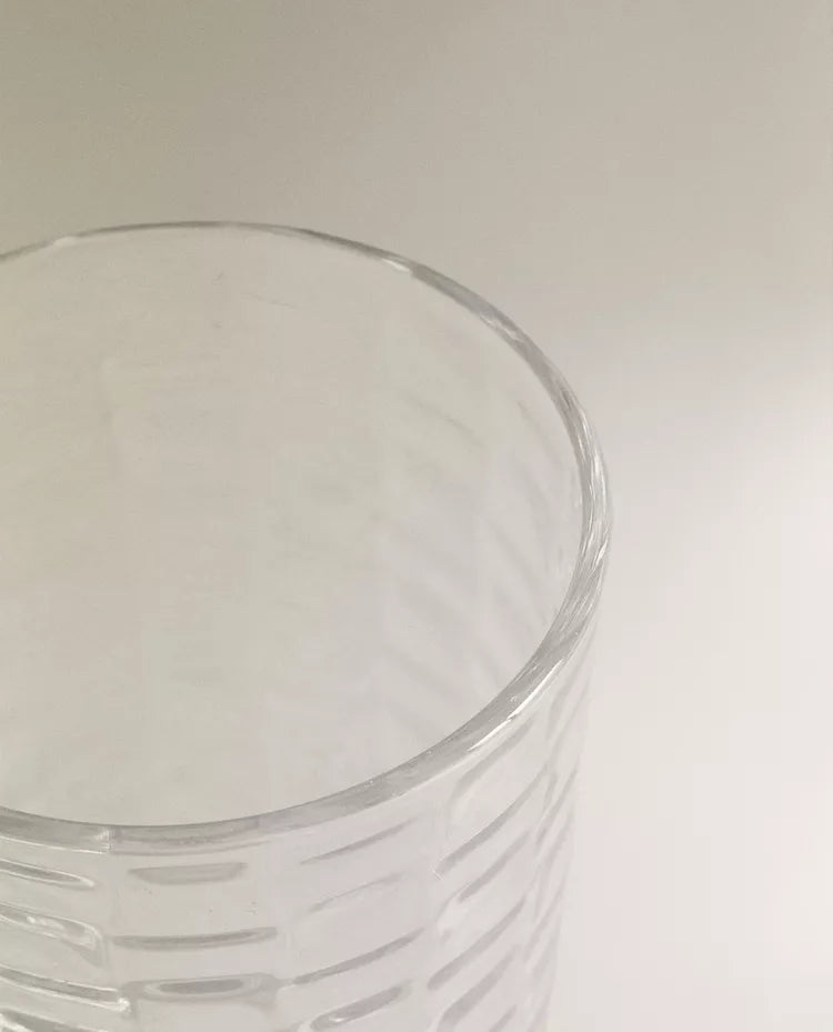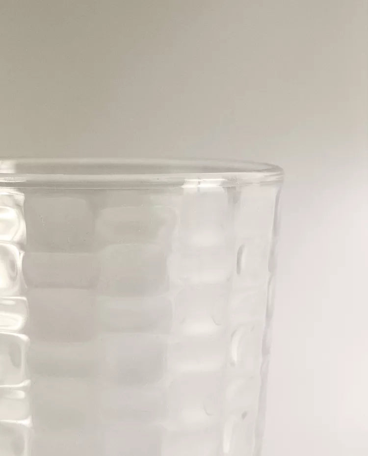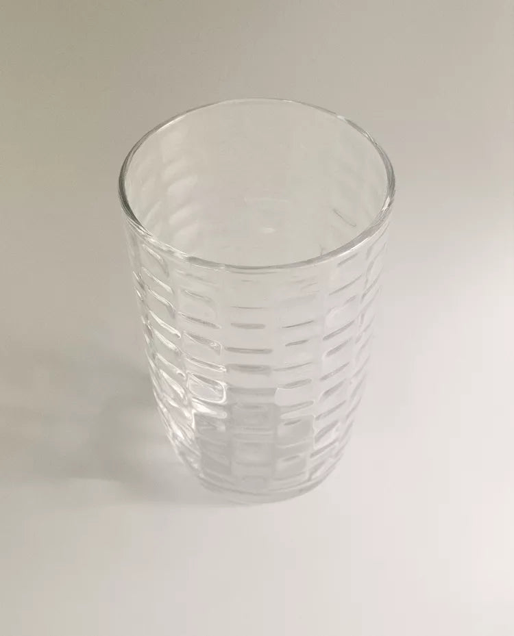 Copo de vidro com relevo de quadrados no interior. Capacidade: 39 ml Altura Largura Profundidade 12cm 4.5cm 8.5c Read more