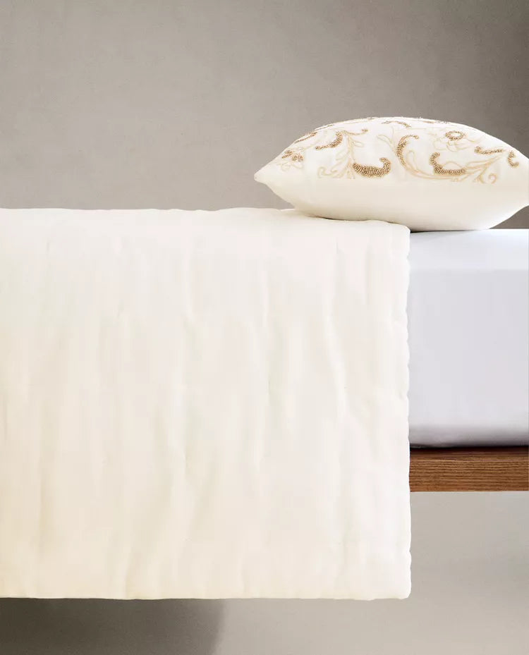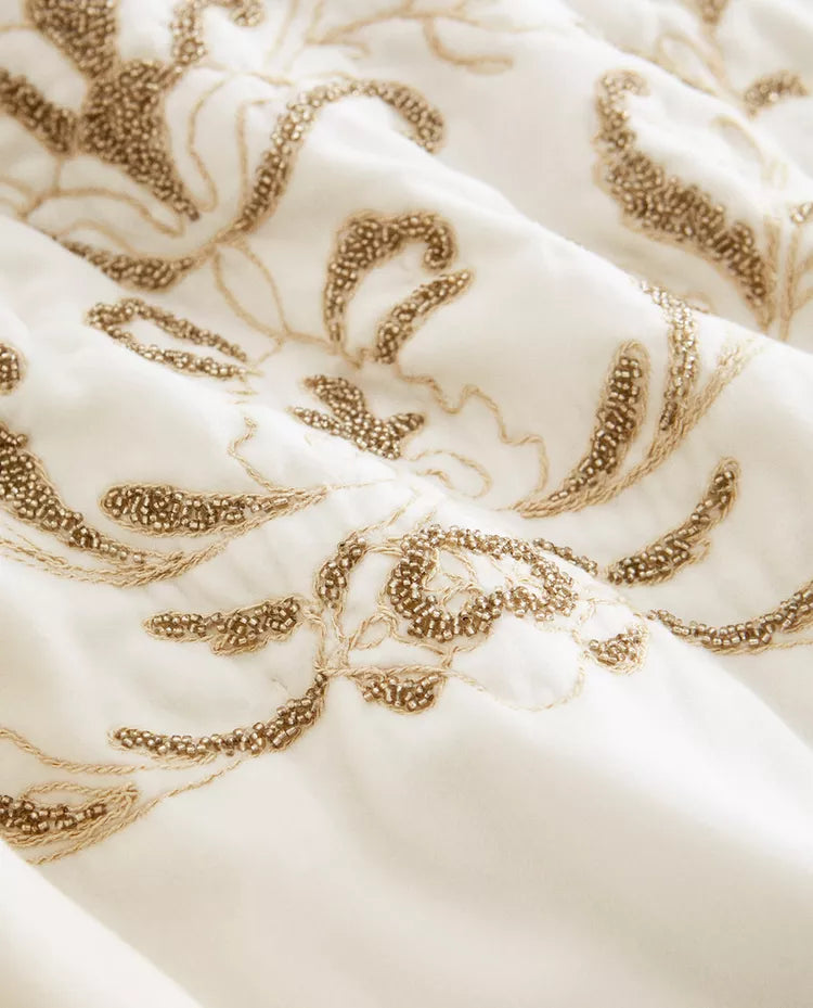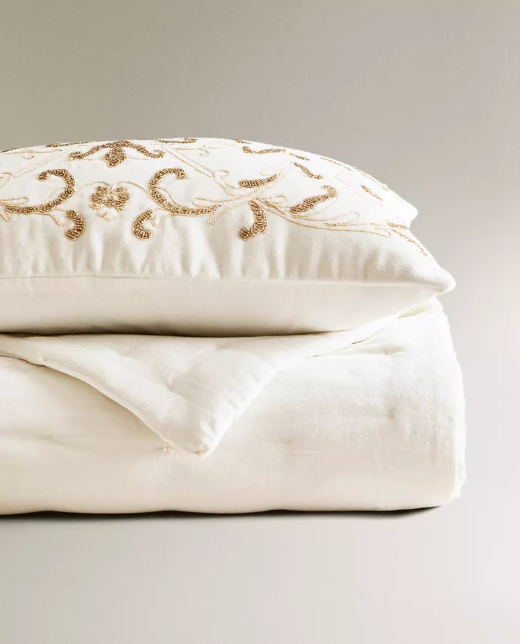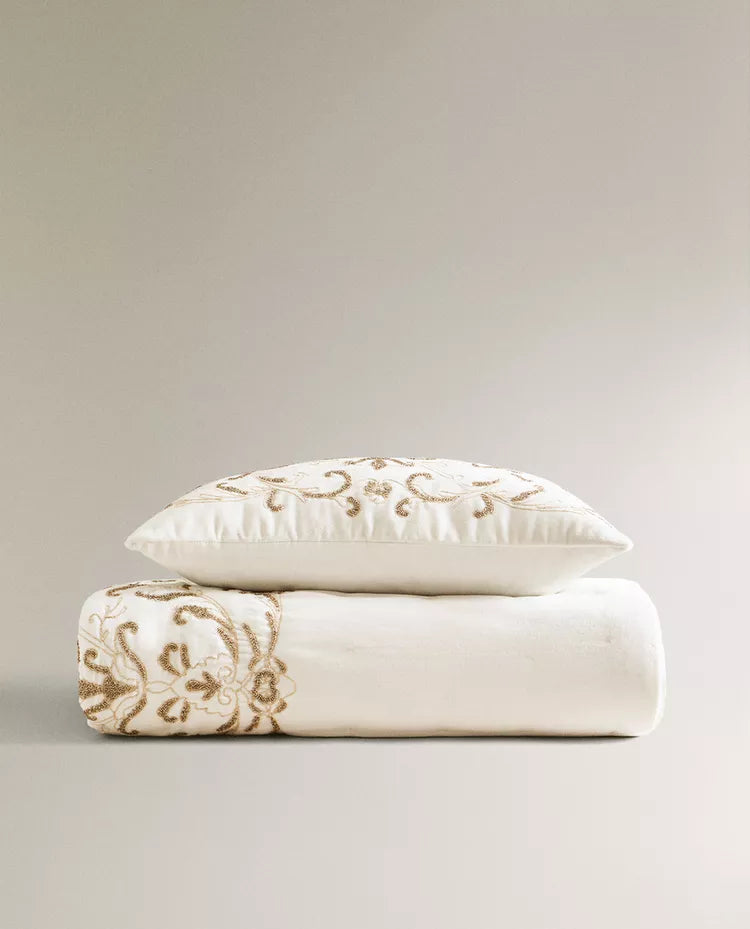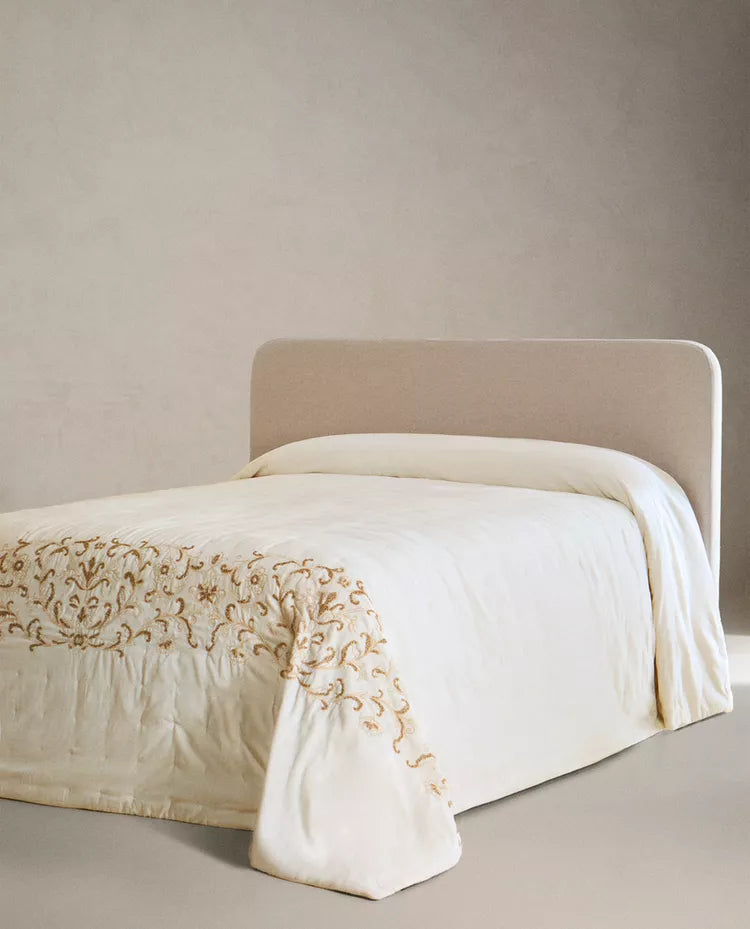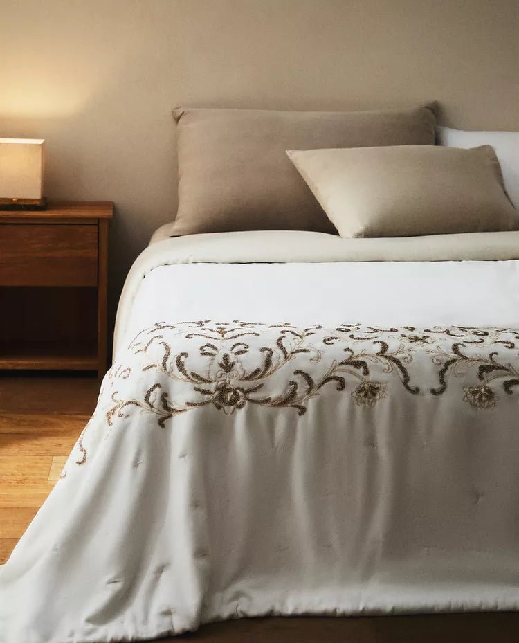 Edredão confecionado em algodão com bordados florais à base de contas. Tem um tato com efeito aveludado. Tamanho Cama 135/140/150/160... Read more