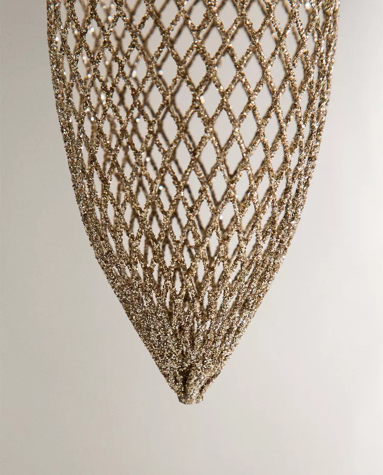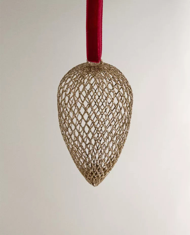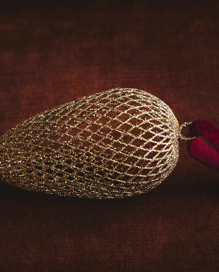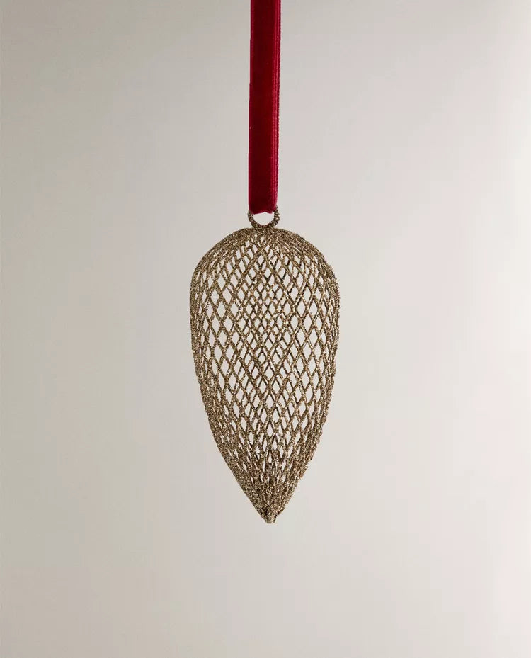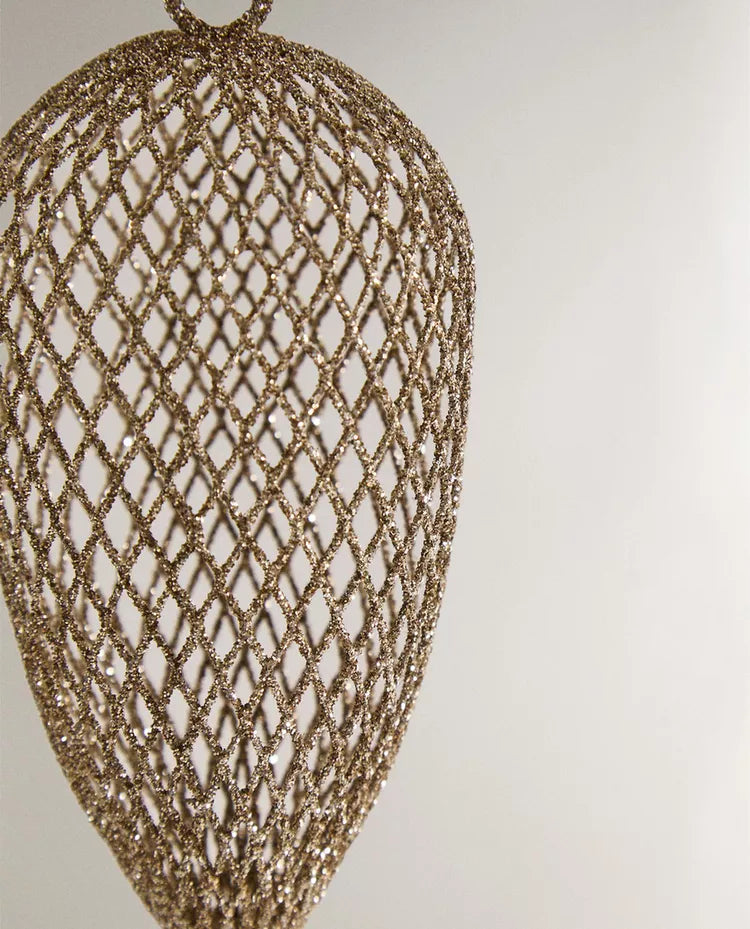 Enfeite para árvore de Natal em forma de bola comprida com design de rede coberta de purpurina. Altura Largura Profundidade... Read more