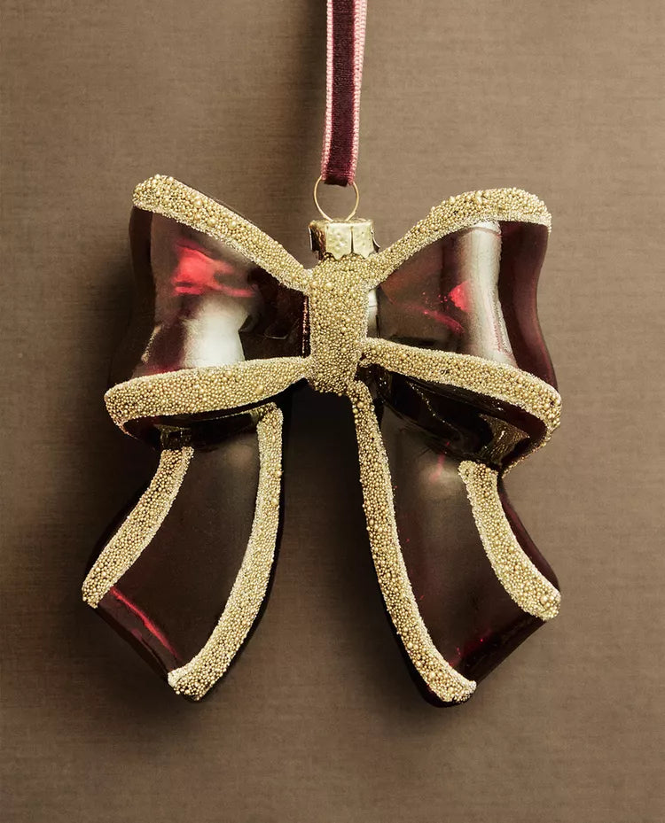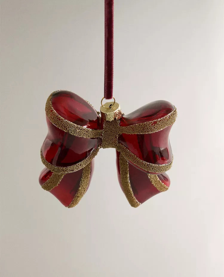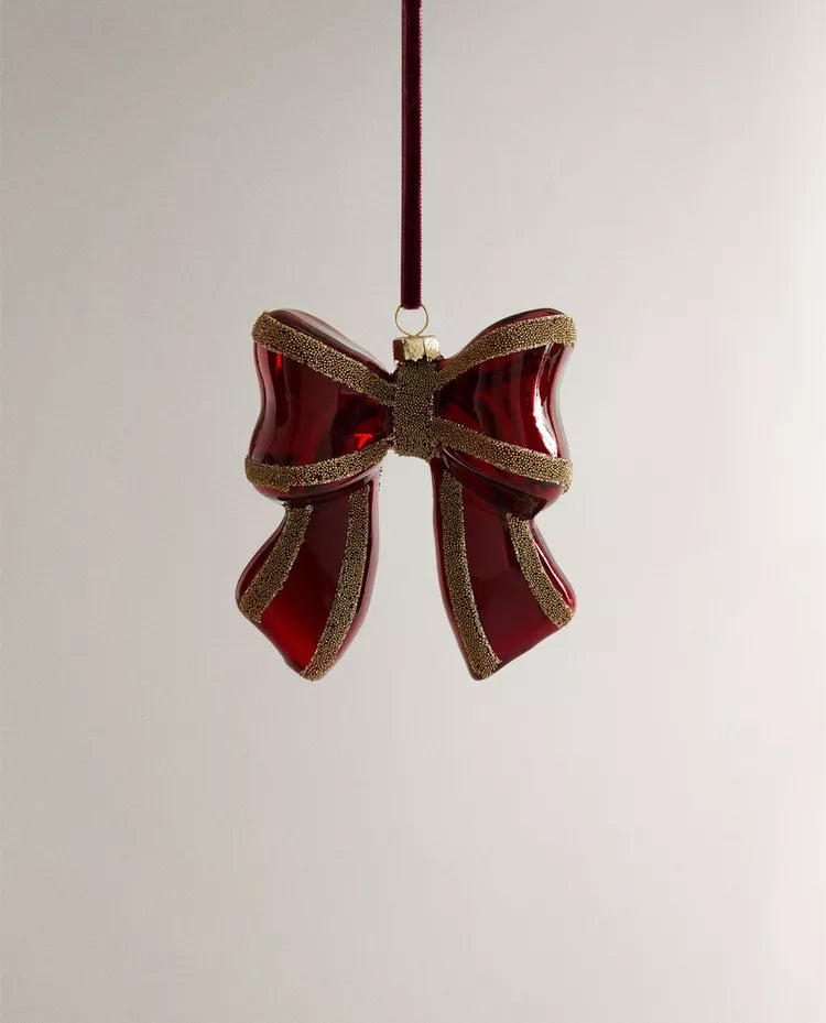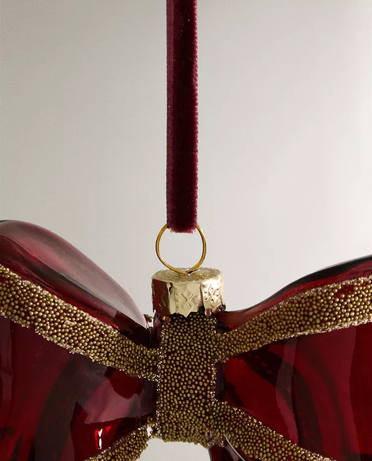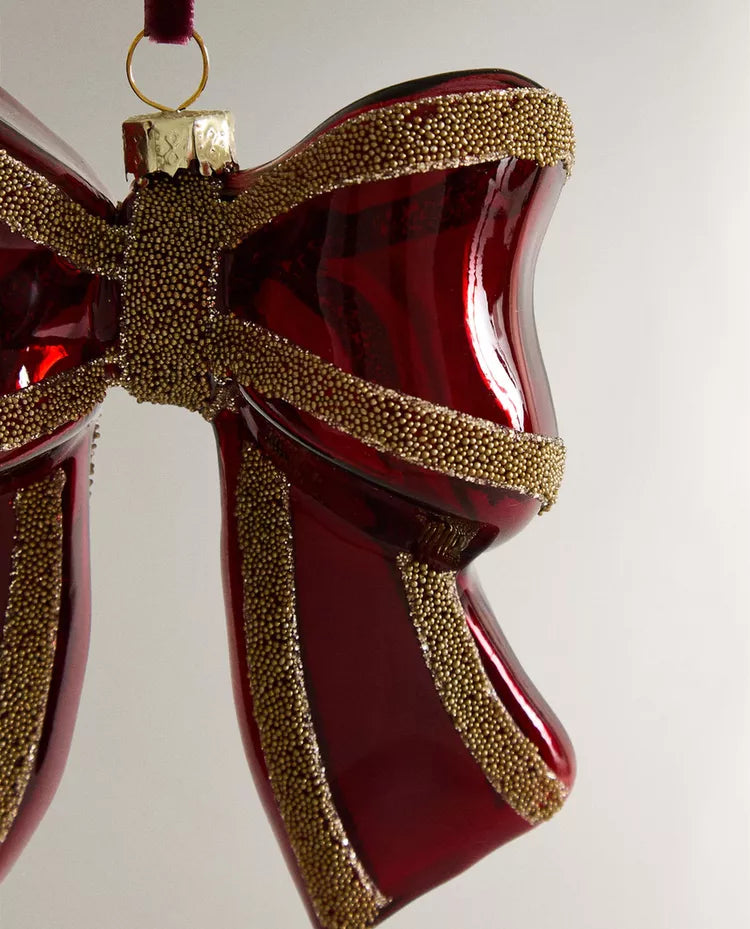 Enfeite para árvore de Natal em forma de laço, elaborado em vidro e decorado com purpurina. Altura Largura Profundidade 10cm... Read more