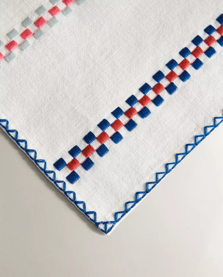 Individual confecionado em algodão com pormenor de rebordos multicoloridos bordados. Tamanho 35 x 50 cm Read more