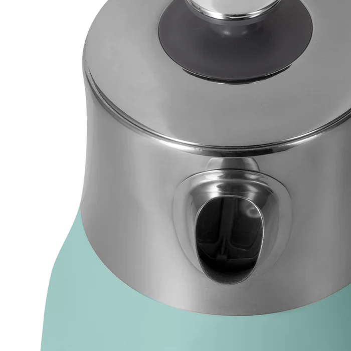 O segundo modelo do jarro eléctrico retro Vintage Cuisine, com um design completamente diferente: um formato alongado único, uma pega na lateral para uma utilização mais cómoda e quase a mesma capacidade! O corpo em aço inoxidável lacado protege o equipamento da ferrugem e a base de aquecimento de 360° assegura uma utilização confortável da chaleira.