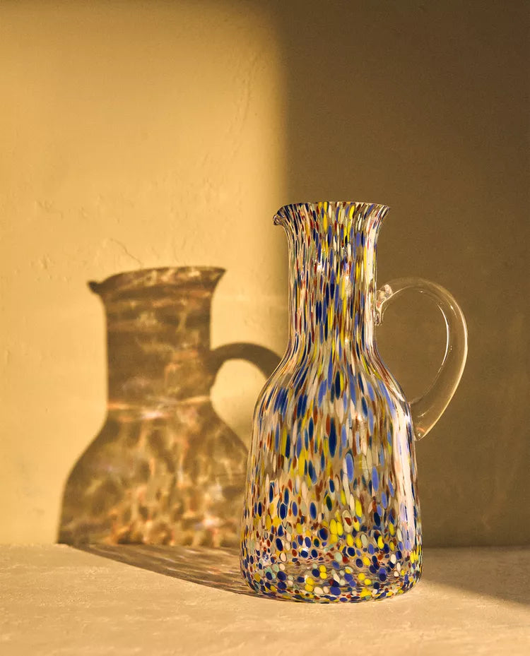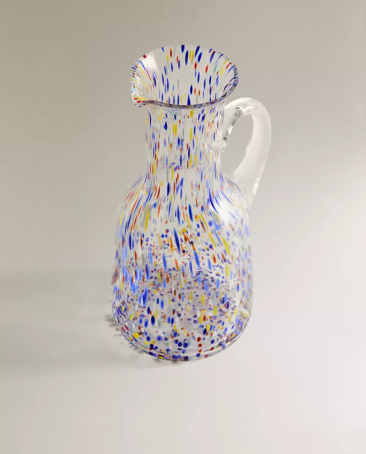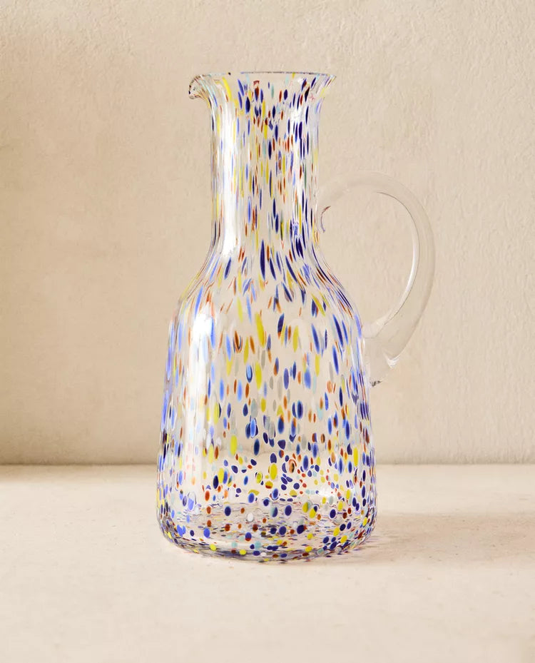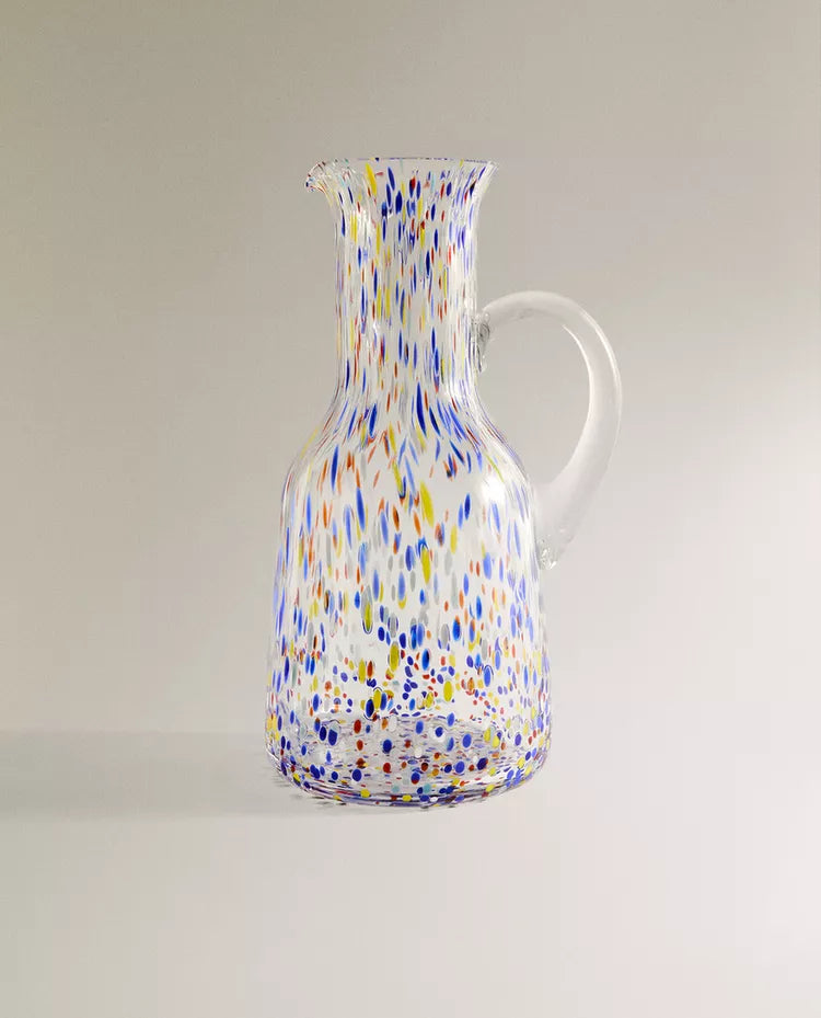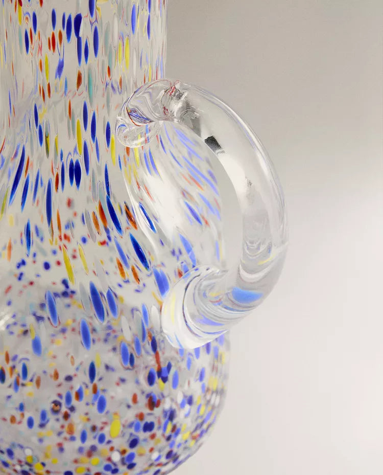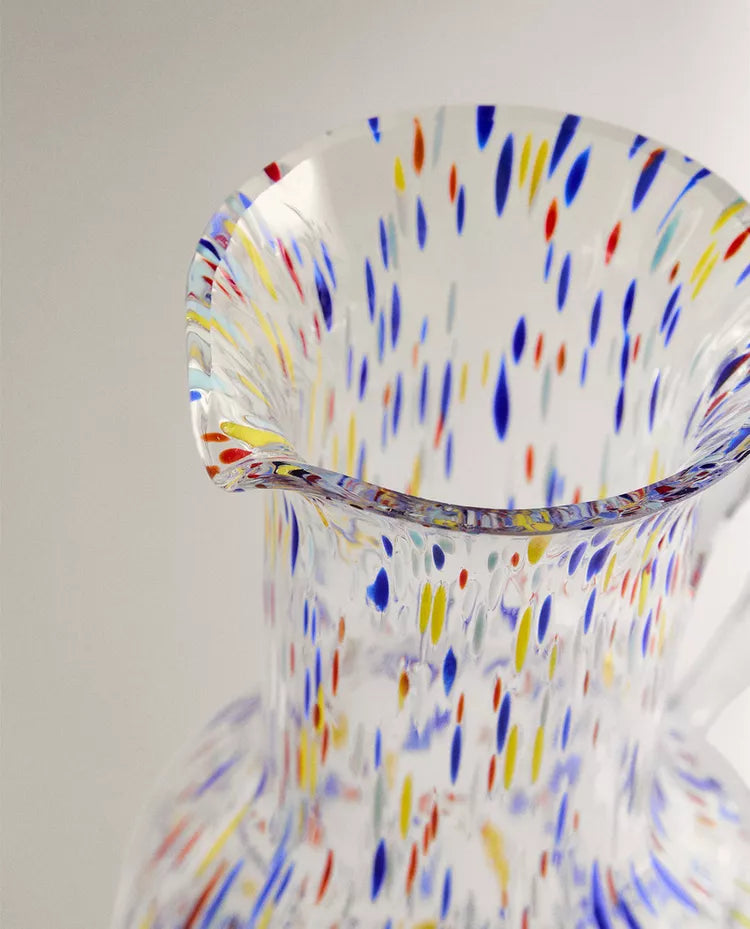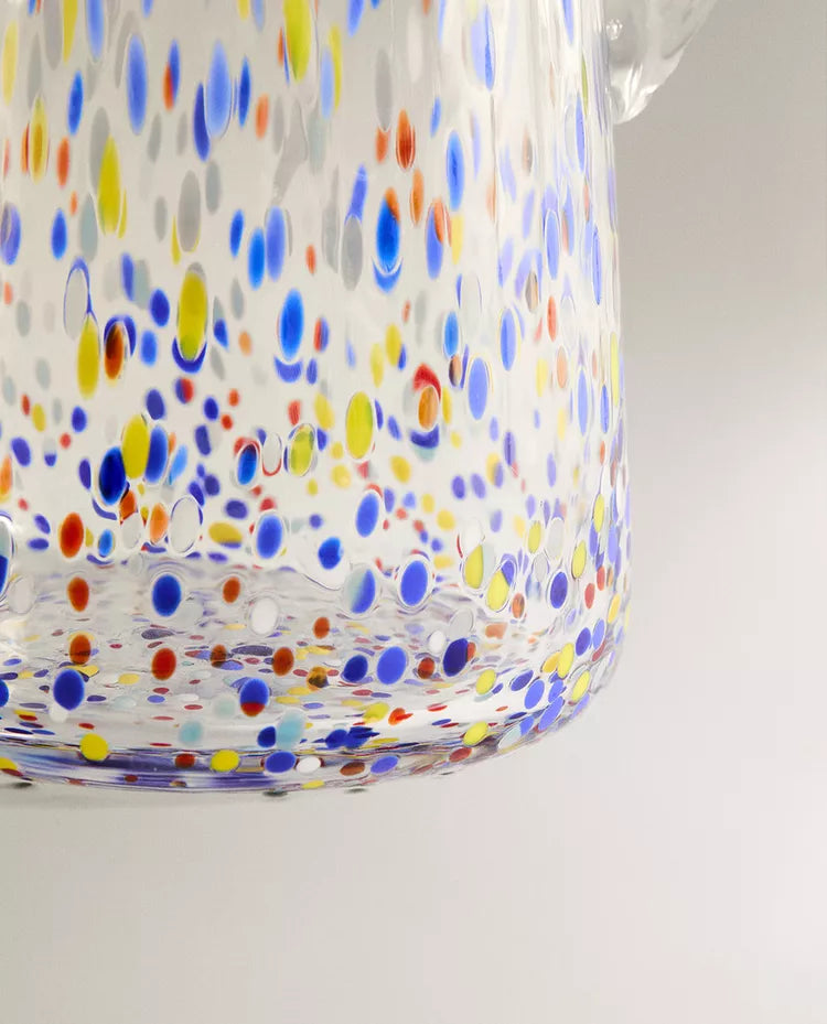 Jarro de vidro soprado com pintas multicoloridas. Capacidade: 1520 ml Altura Largura Profundidade 26.5cm 14.3cm 26.5cm Read more