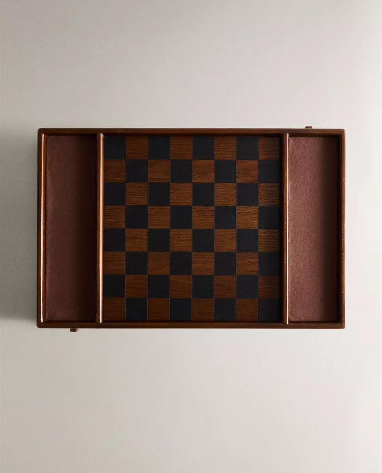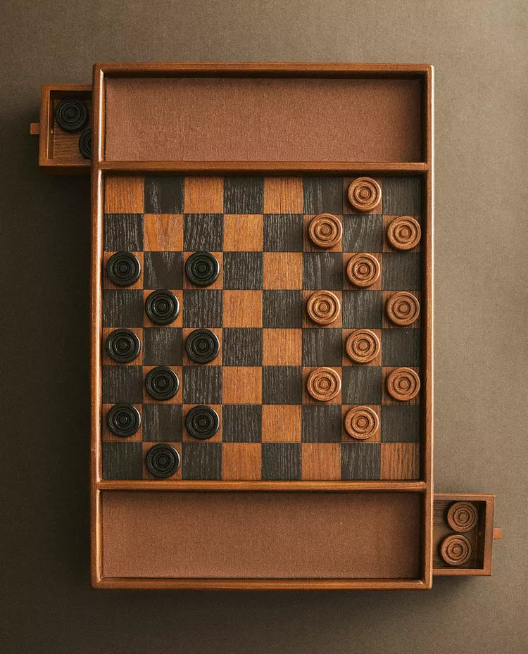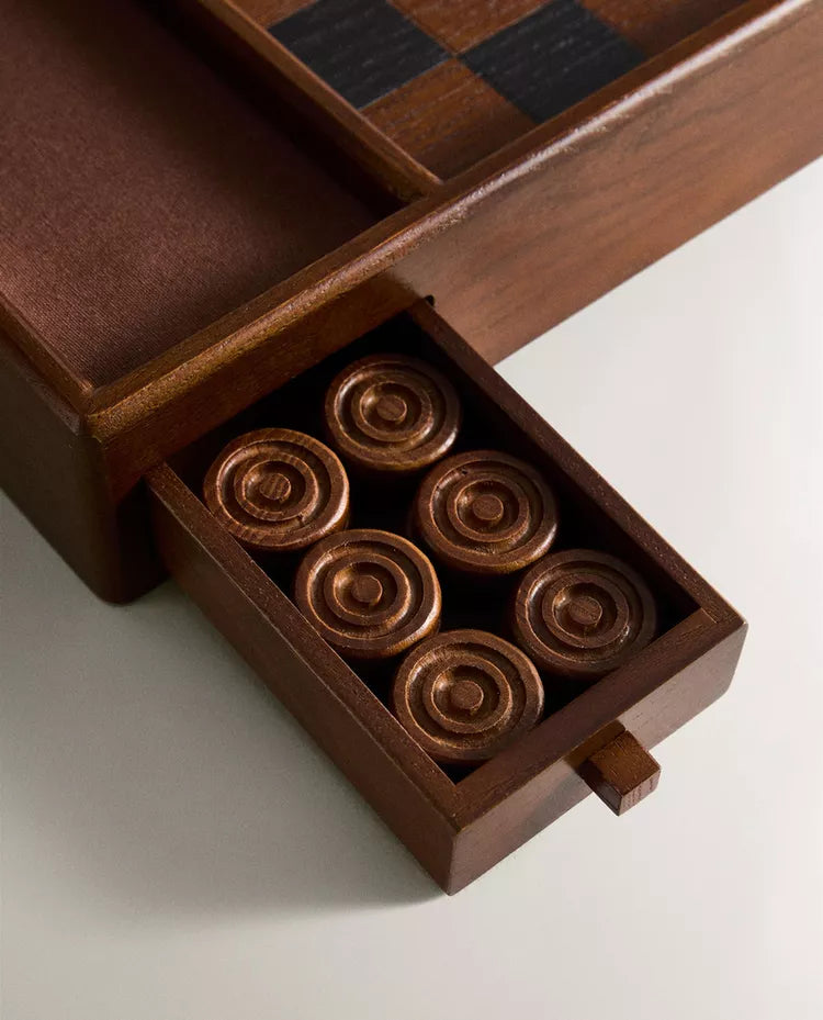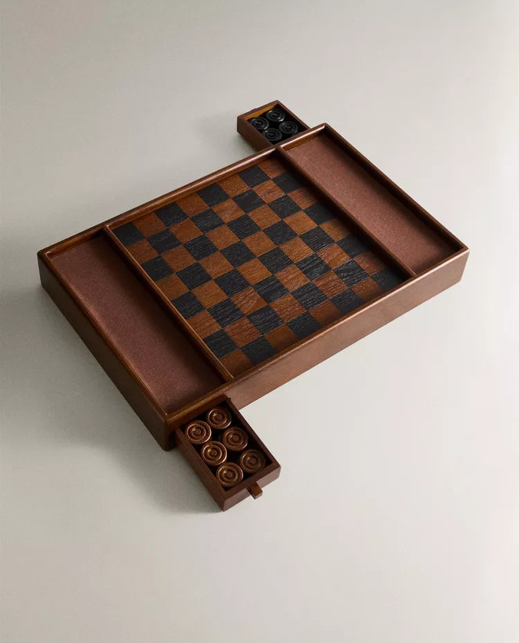 Jogo de damas em madeira de freixo com compartimentos laterais para guardar as fichas.O jogo inclui 24 fichas (12 brancas... Read more