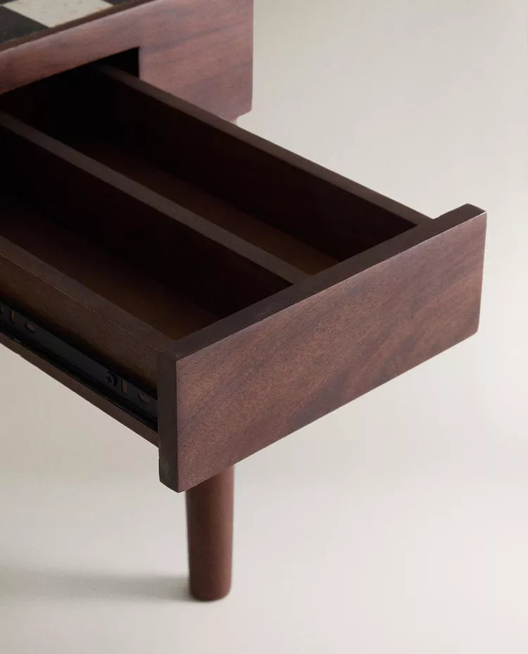 Mesa auxiliar de madeira de teca com tabuleiro de xadrez em mármore na parte superior. Tem uma gaveta semioculta com... Read more