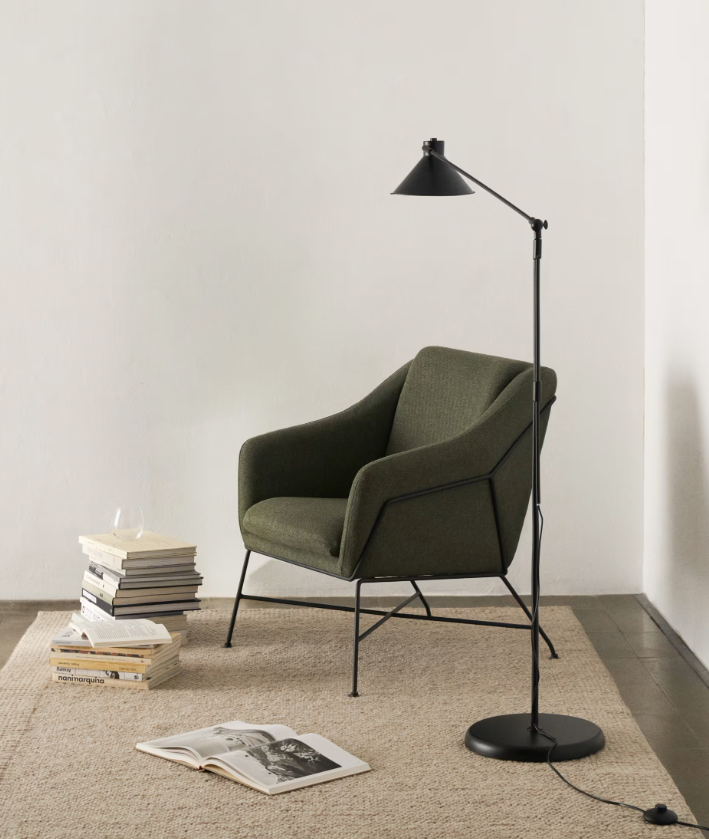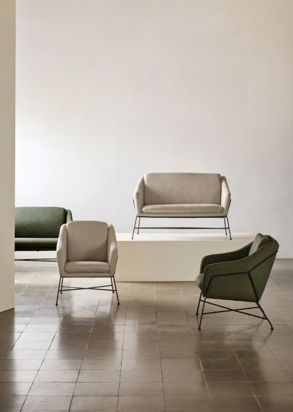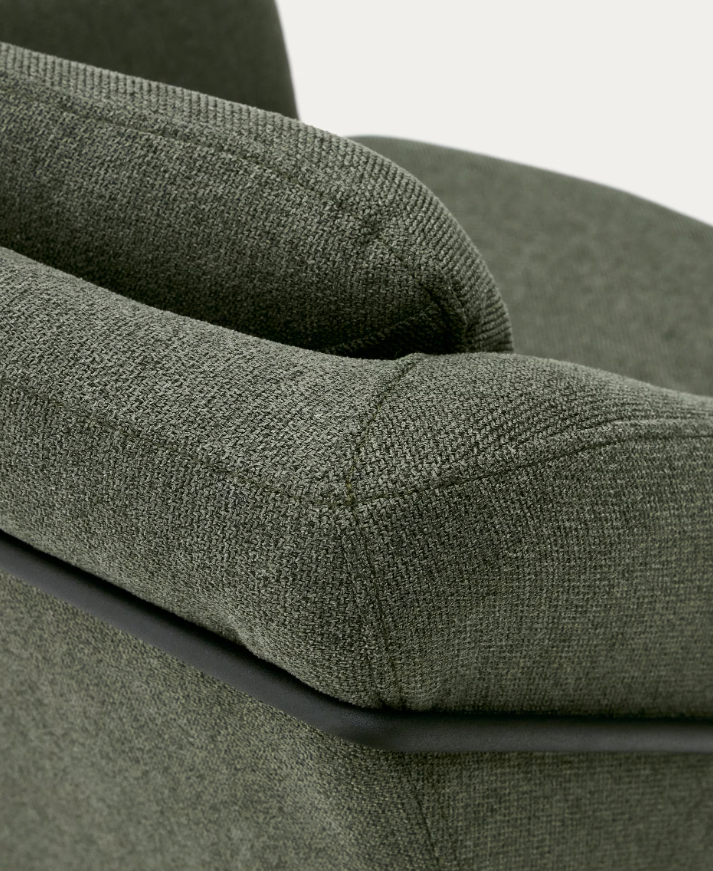 Poltrona estofada em tecido estruturado verde. Design contemporâneo de volumes assimétricos com estruturas à vista. Estrutura de aço pintado de... Read more