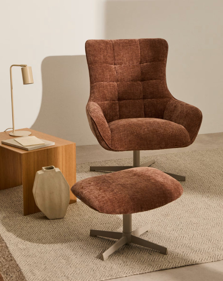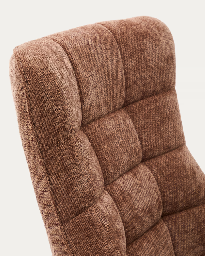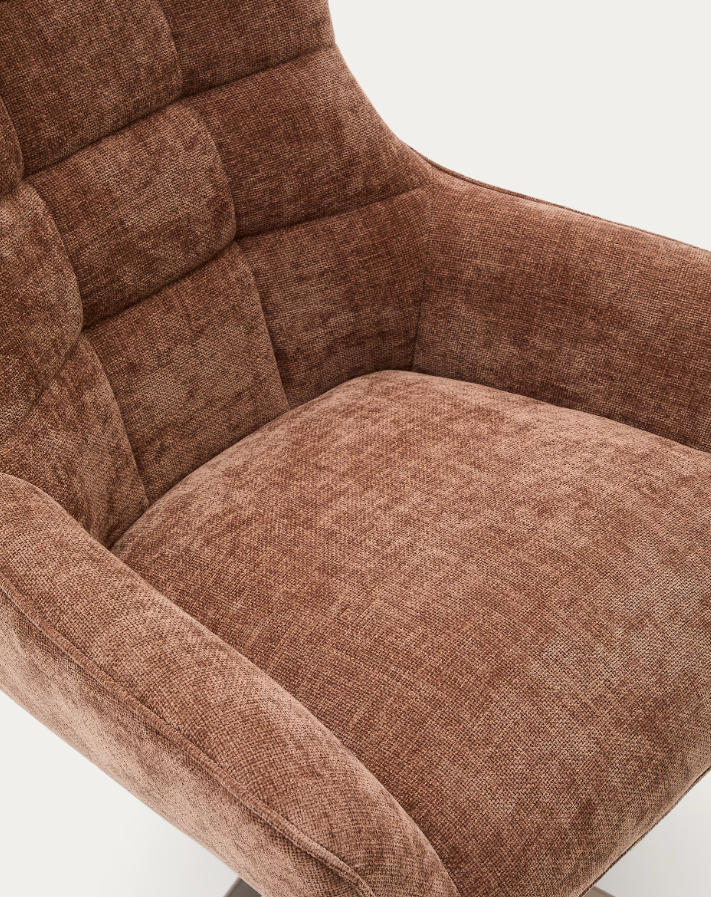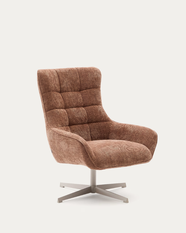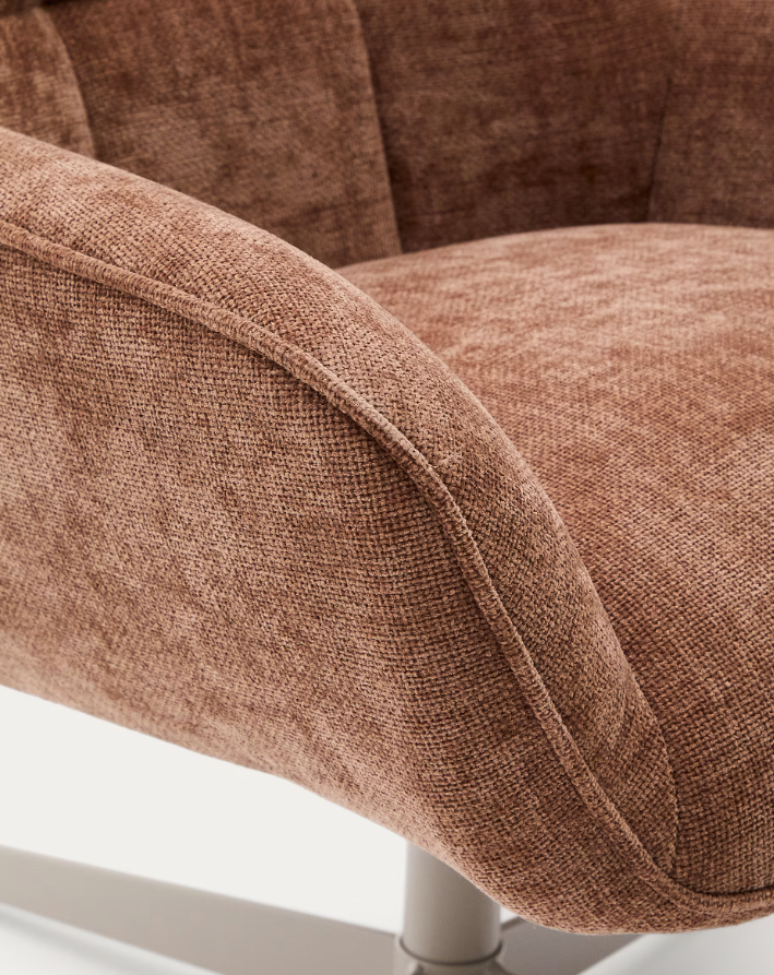 Poltrona giratória com braços acolchoada estofada em tecido chenille com estrutura pequena e toque suave na cor castanho-claro. Estrutura em... Read more