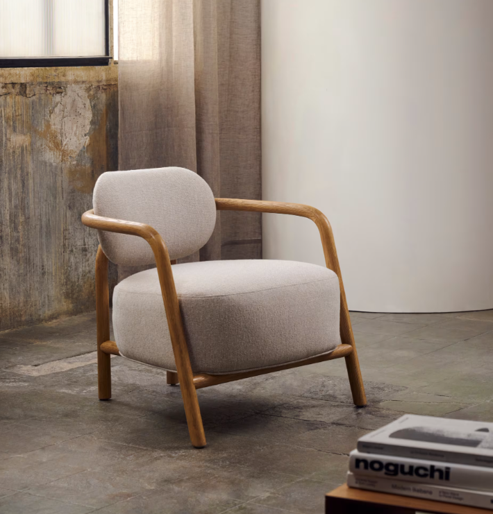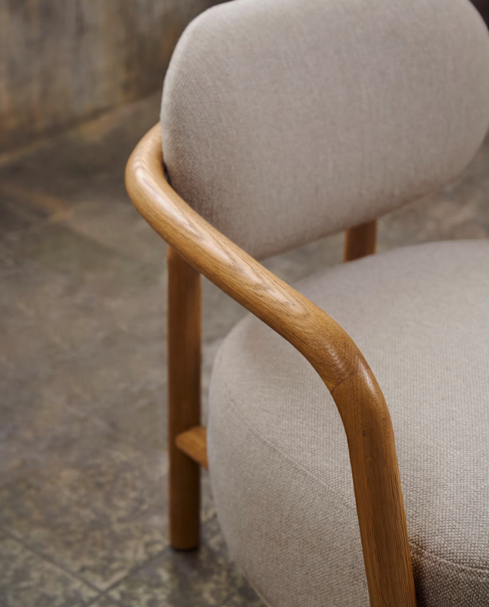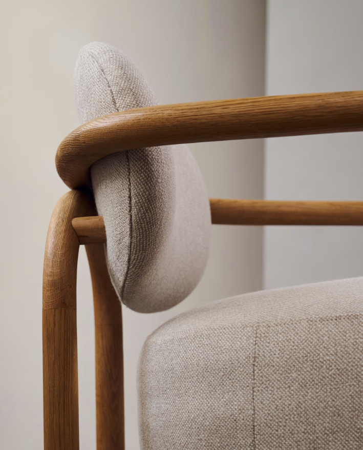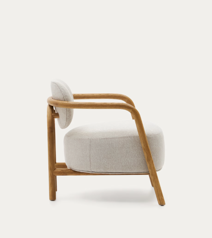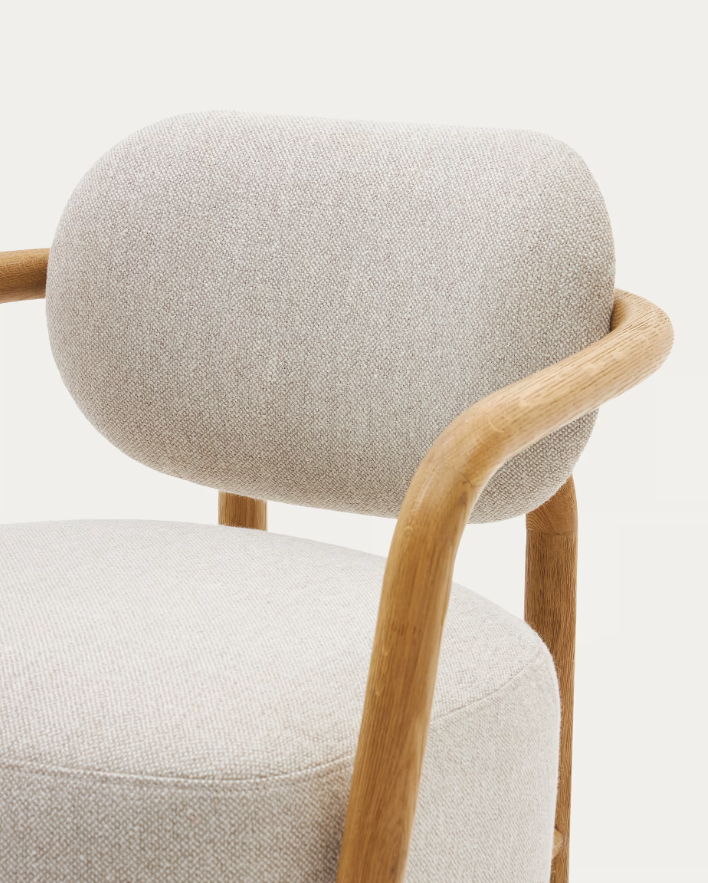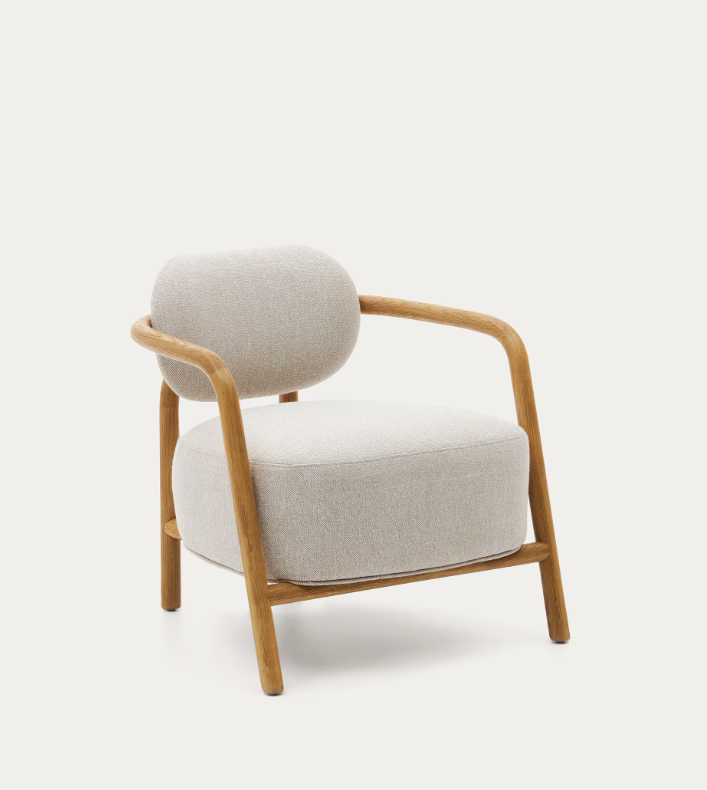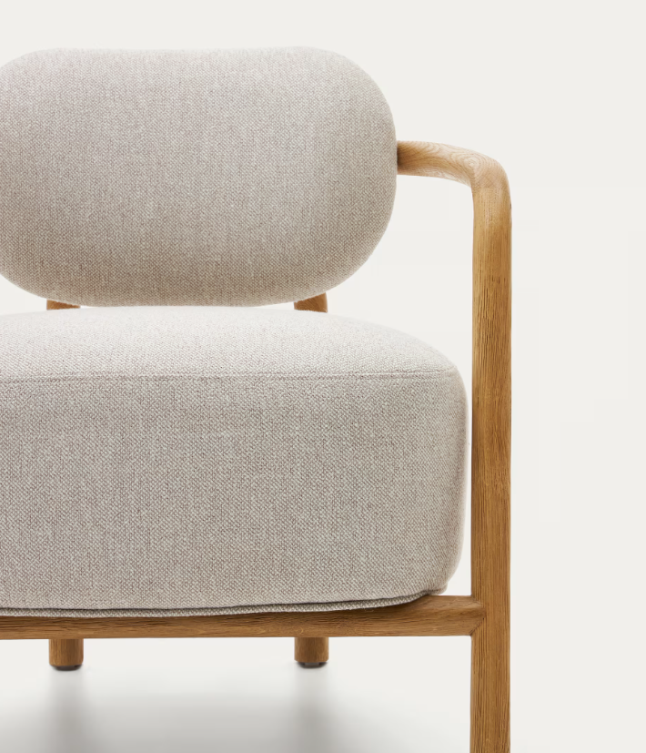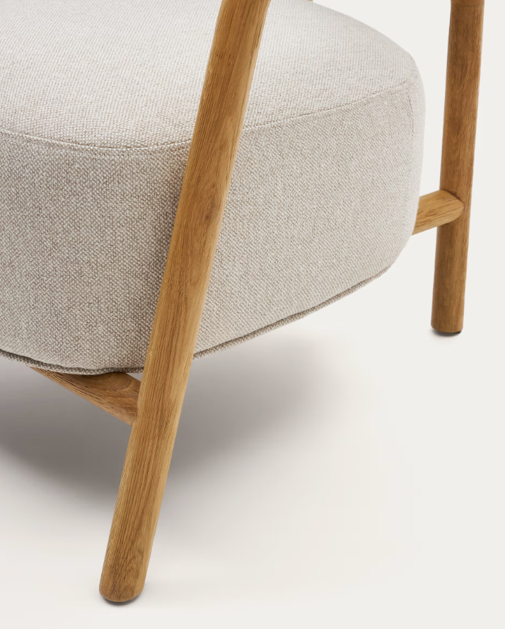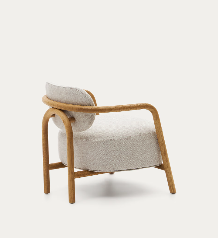 Poltrona Melqui bege de madeira maciça de carvalho com acabamento natural