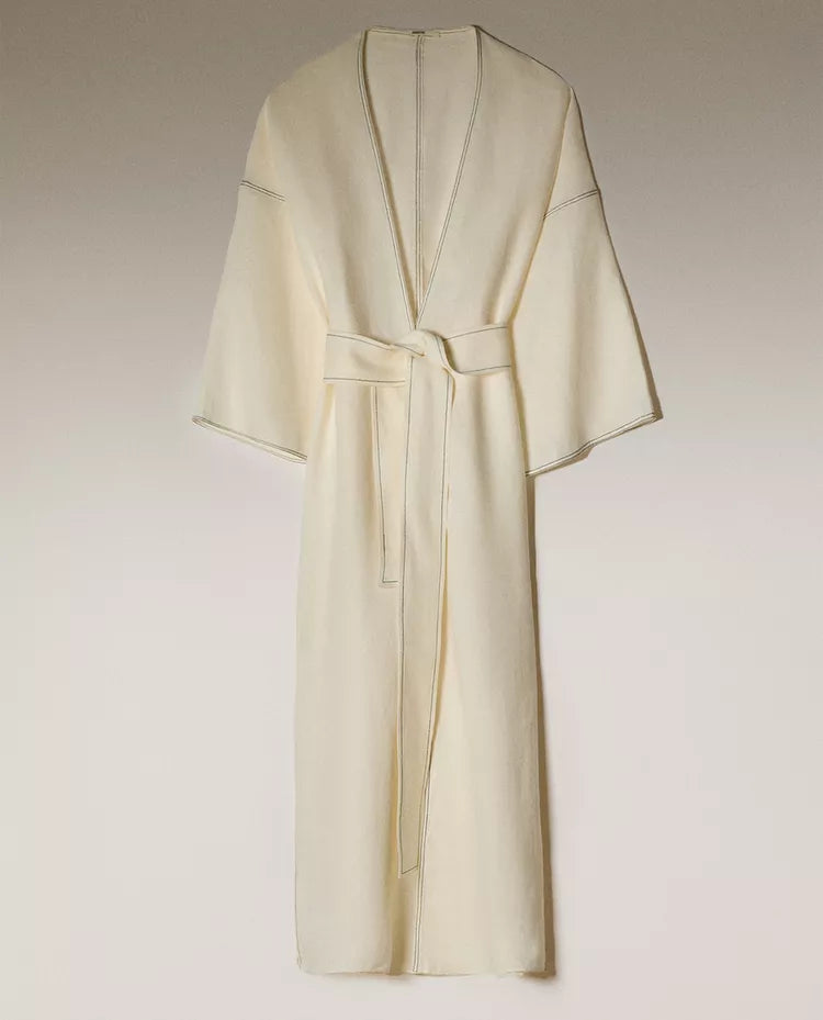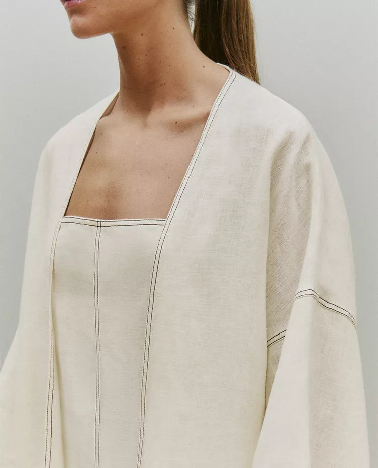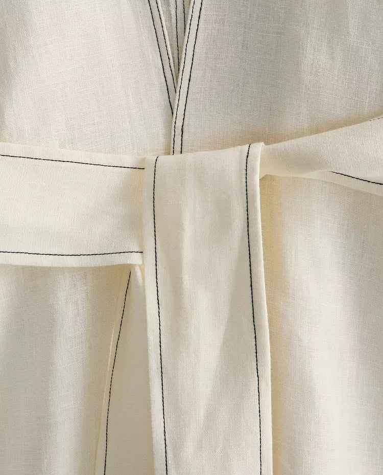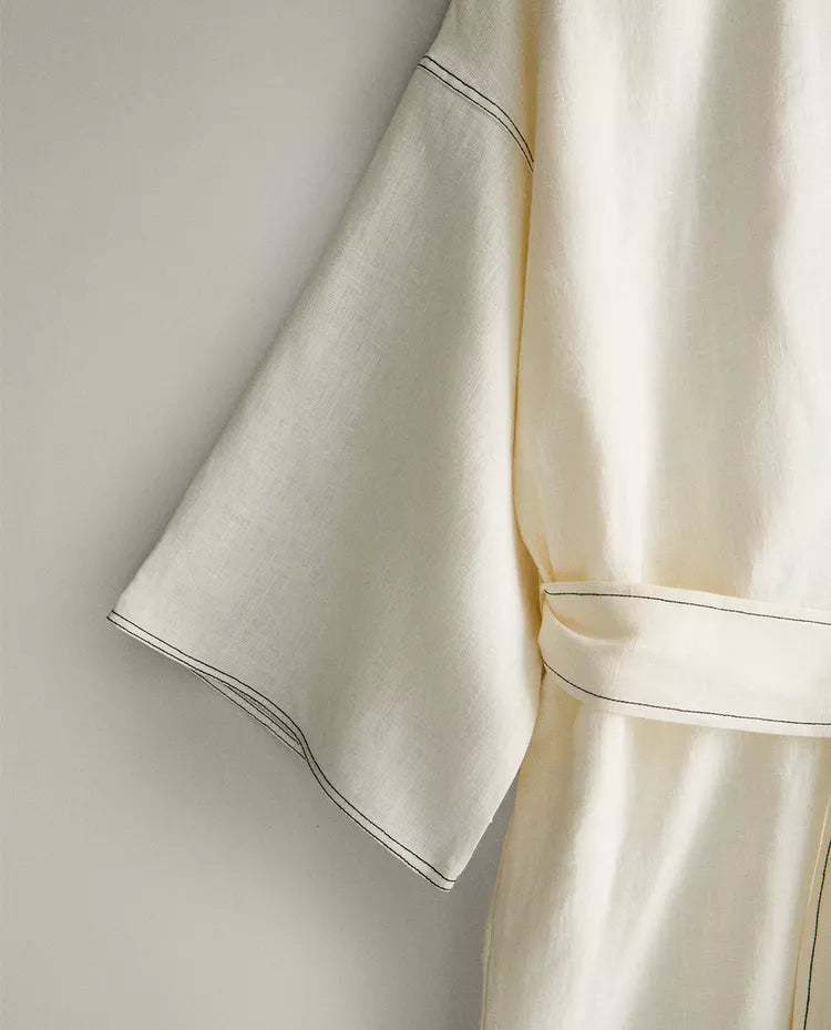 Robe de manga comprida em linho com pormenor de pesponto em preto a contrastar. Tamanho S-M M-L Read more