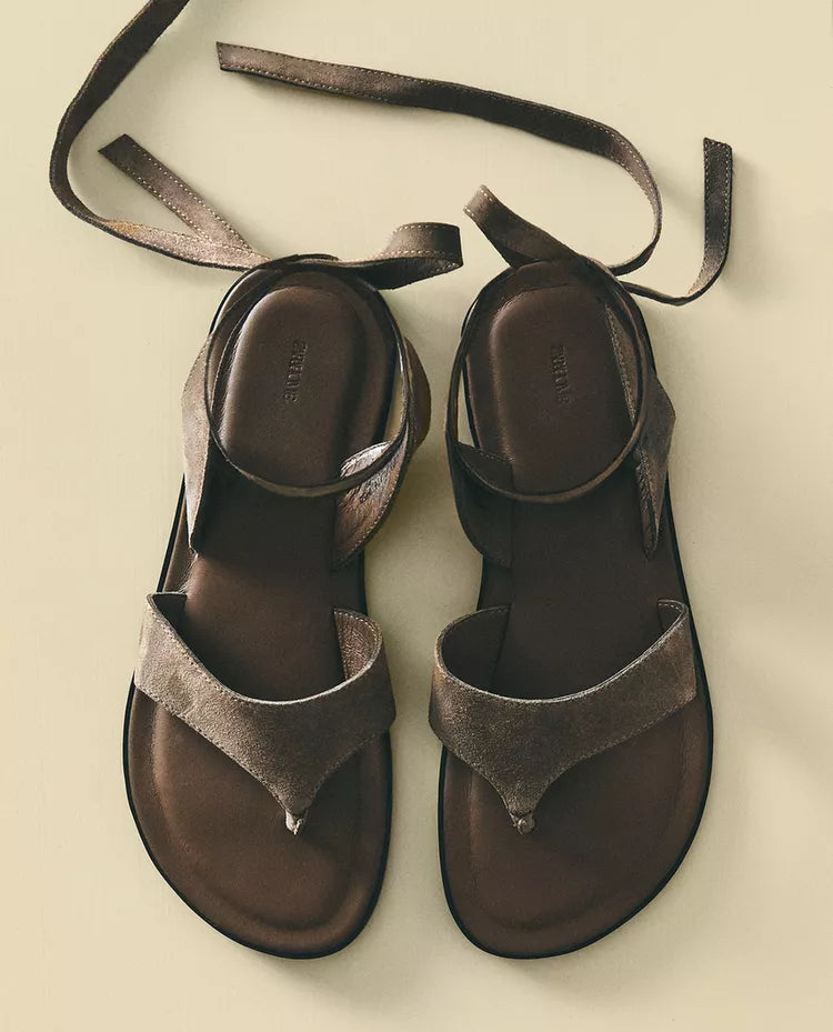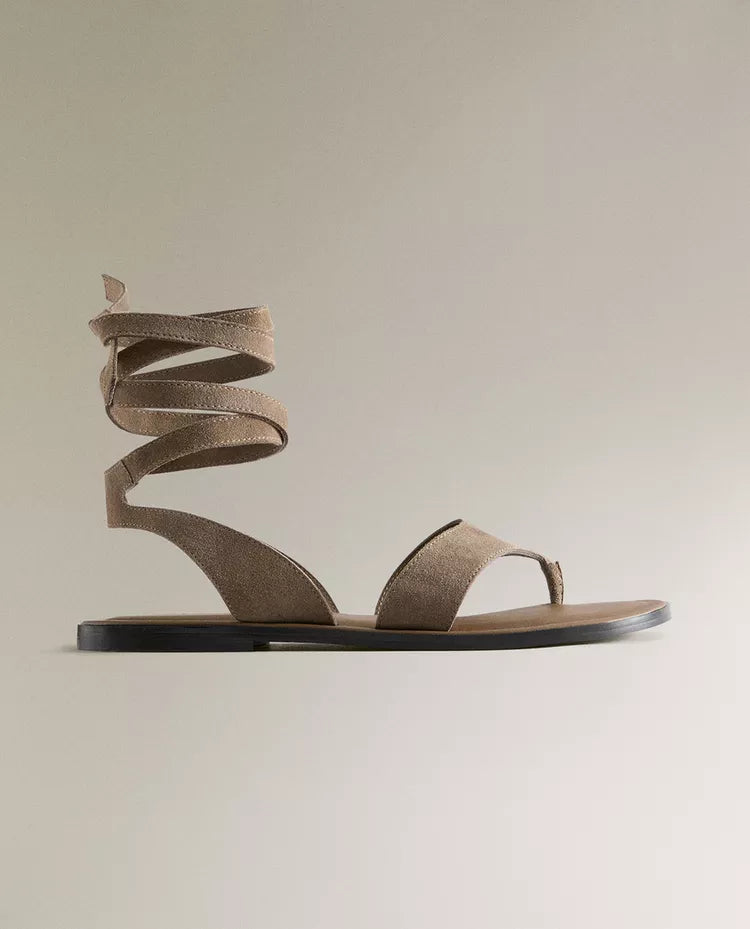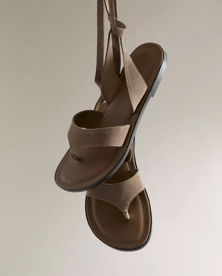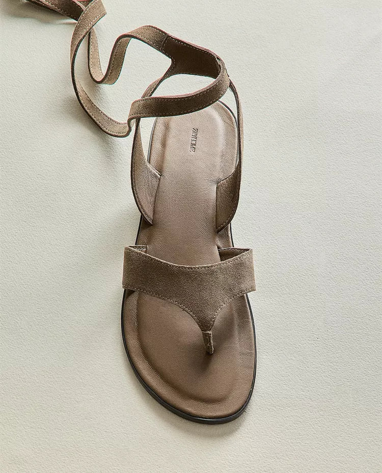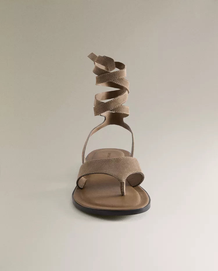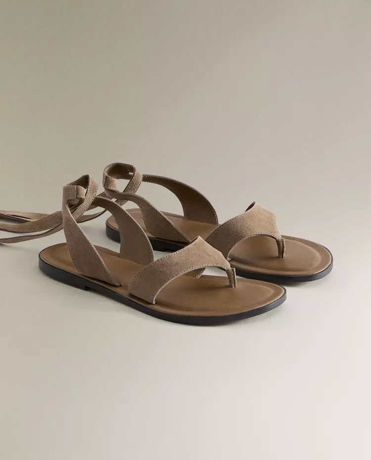 Sandálias rasas de pele com acabamento em croute. Pormenor de tiras com posição para os dedos. Fecho de tiras atadas... Read more