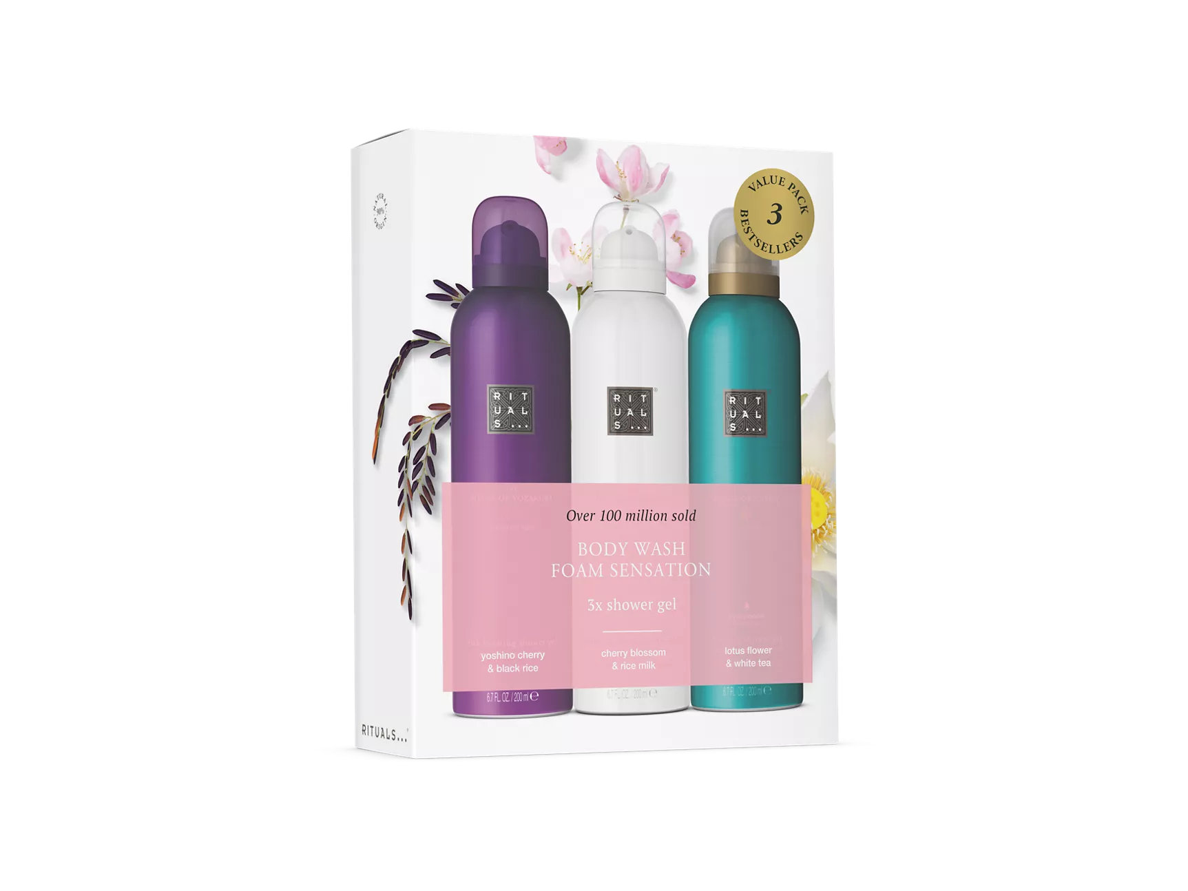 Compre de forma inteligente ou mime alguém de quem gosta com o nosso conjunto promocional de espumas de duche em três das nossas fragrâncias mais vendidas. The Ritual of Sakura, enriquecido com leite de arroz nutritivo e flor de cerejeira doce; The Ritual of Yozakura, uma combinação sensual de flores brancas, baunilha quente e leite de amêndoas; e The Ritual of Karma, com uma revigorante fragrância estival e o nosso Complexo Hydra-Boost, para uma pele suave e hidratada. Magnífico tanto para mulher como para homem. Com 91% de ingredientes de origem natural.