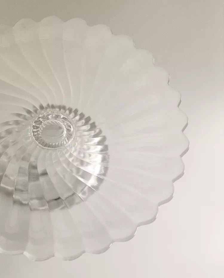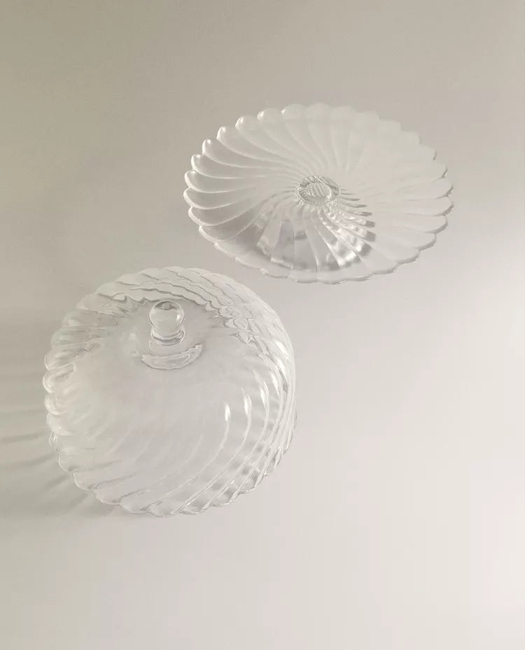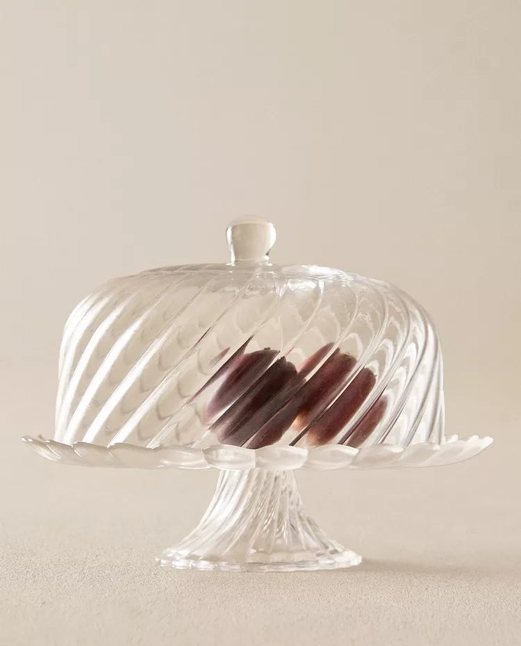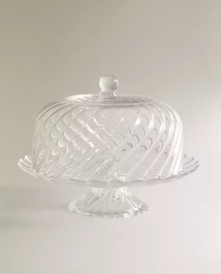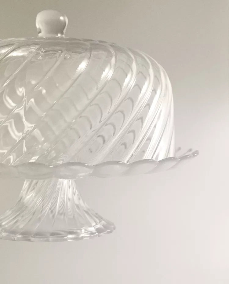 Travessa para bolos em vidro com pé e cúpula com textura de riscas diagonais. Altura Largura Profundidade 21cm 26cm 21cm... Read more